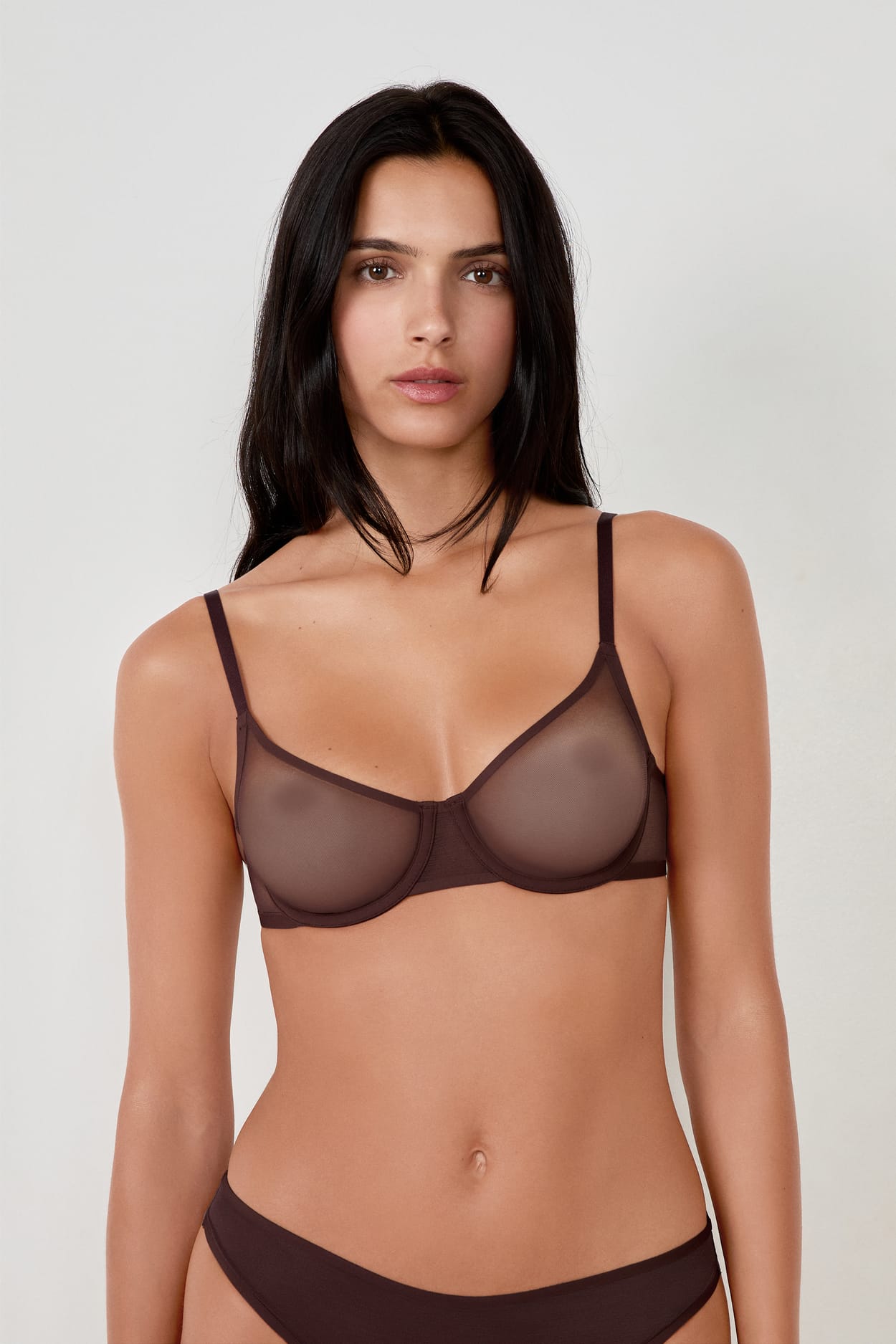 Ce soutien-gorge offre une sensation de légèreté et galbe la poitrine avec sa forme push-up. Muni d'armatures et d'un décolleté plongeant, il opte pour un jeu de transparence résolument sensuel et féminin.