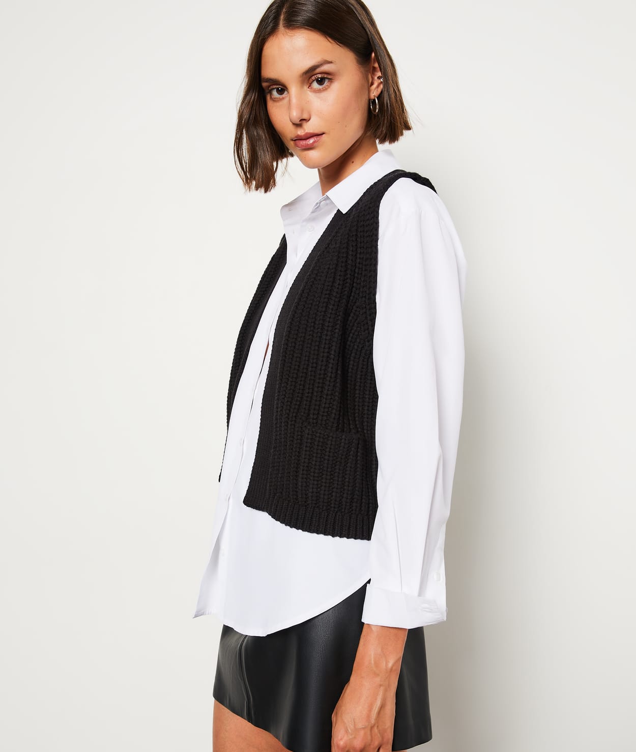 This sleeveless cardigan is the perfect touch to elevate your looks. Made from crochet knit and featuring two pockets, it's perfect for completing your outfit!