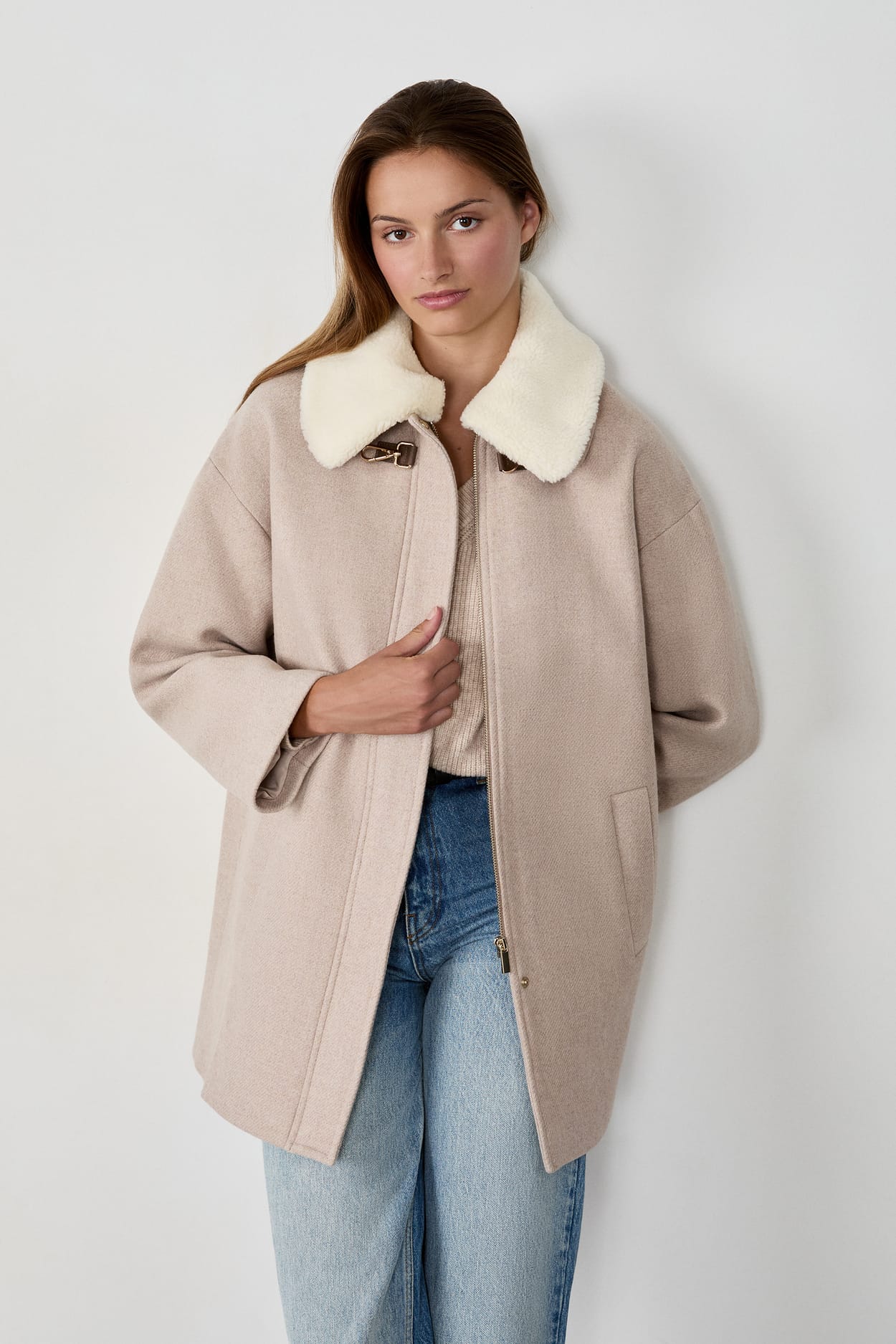 Mid-length coat with wool and faux fur collar;${refinementColor}