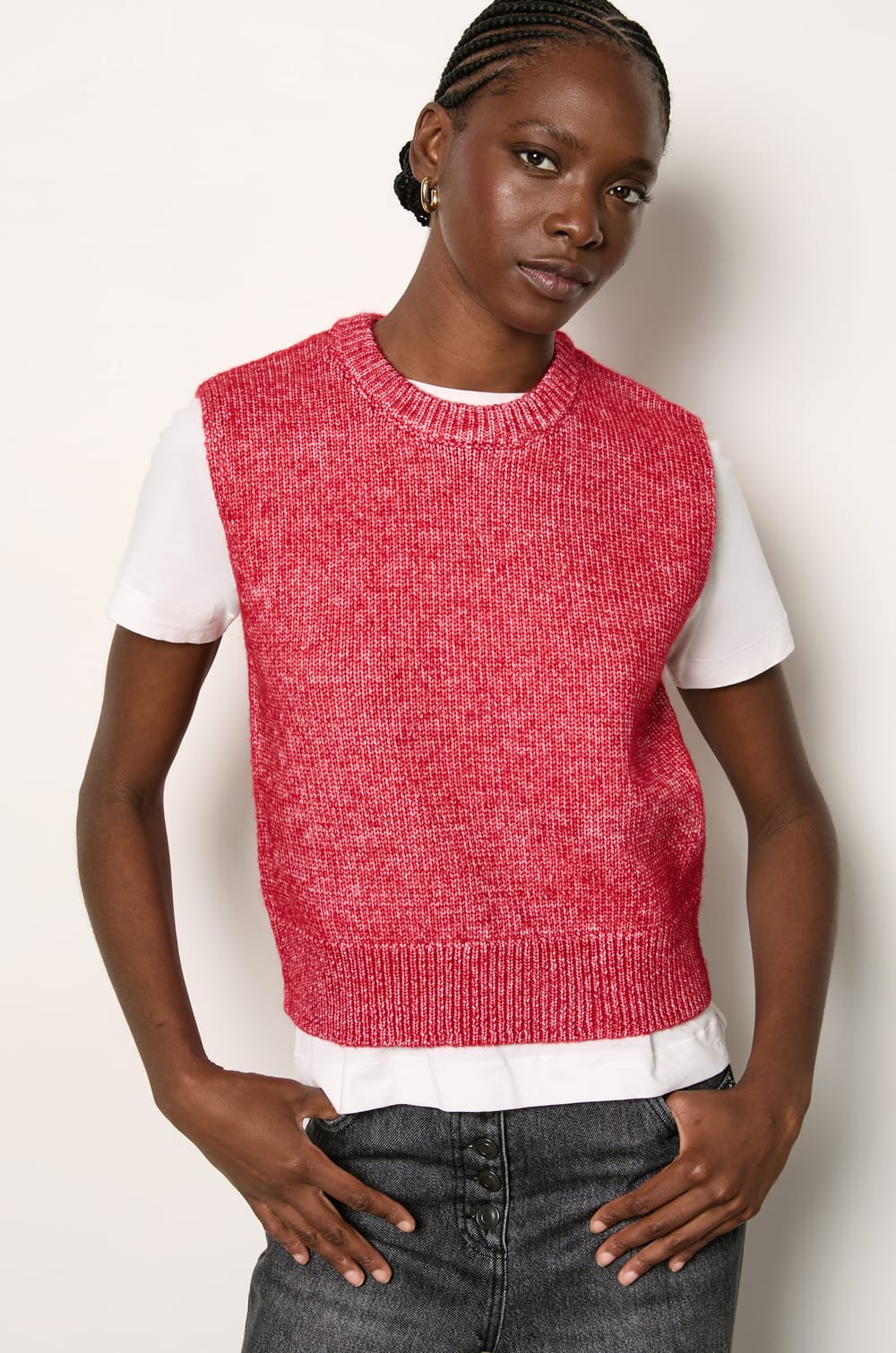 Classic and timeless, this sleeveless fine-knit sweater is a must-have for mastering the art of elegant layering. Whethe...