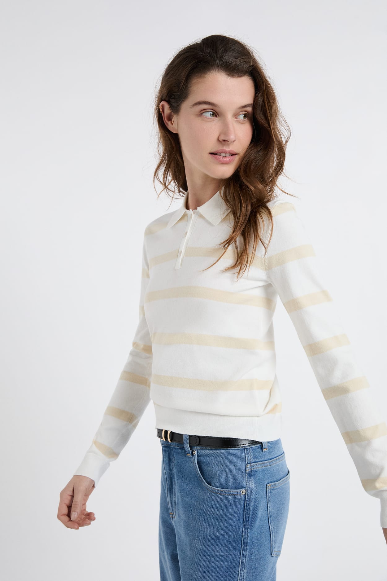 Pull col polo à manches longues à rayures;${refinementColor}