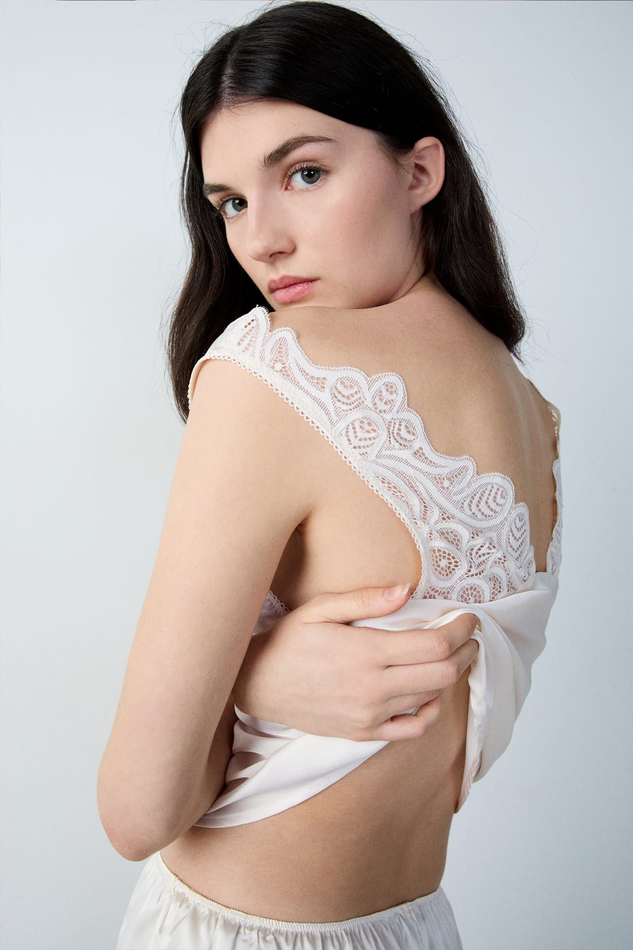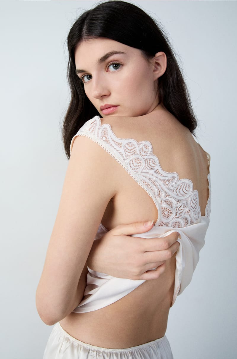 This satin tank top is a key piece for soft nights. Enhanced by delicate lace on the back, it is very elegant.