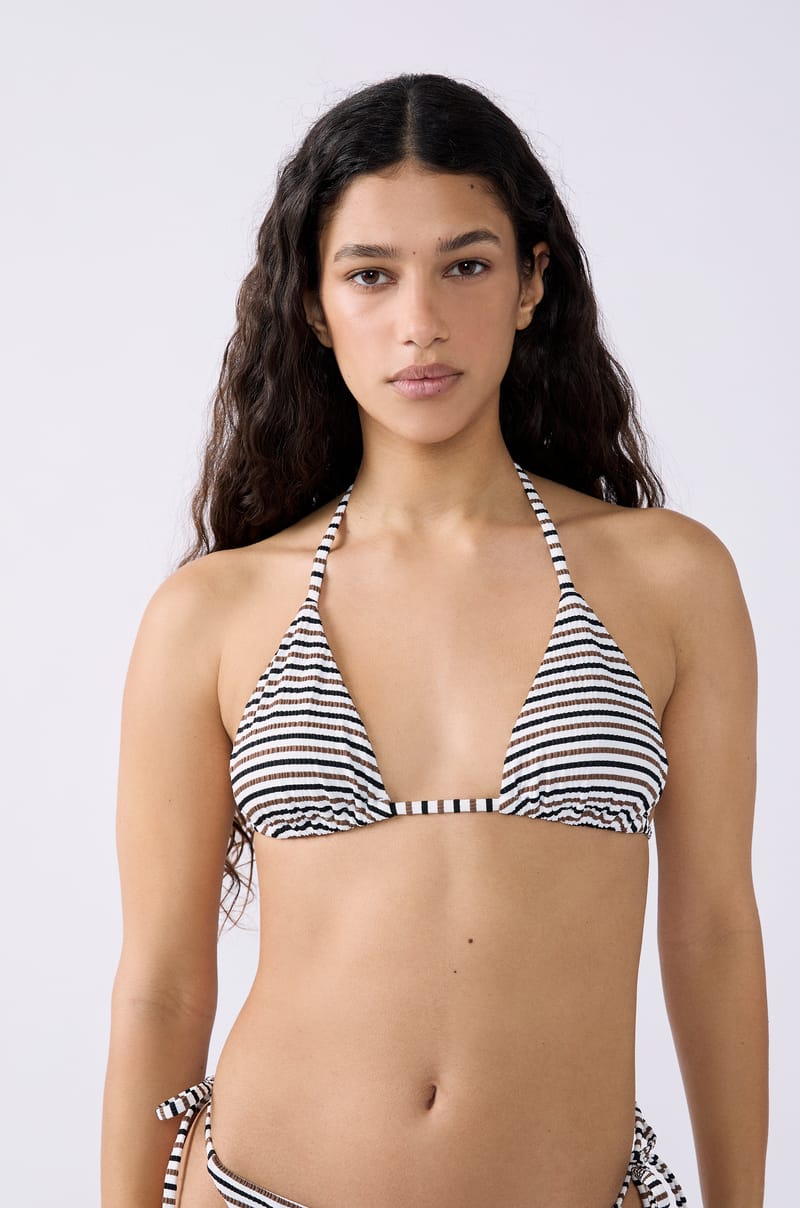 The iconic triangle bikini top shape is adorned this time with subtle contrasting stripes and tie fastenings for a defined waist. An ideal piece to take on your tropical getaways, to be paired with its matching bottom.