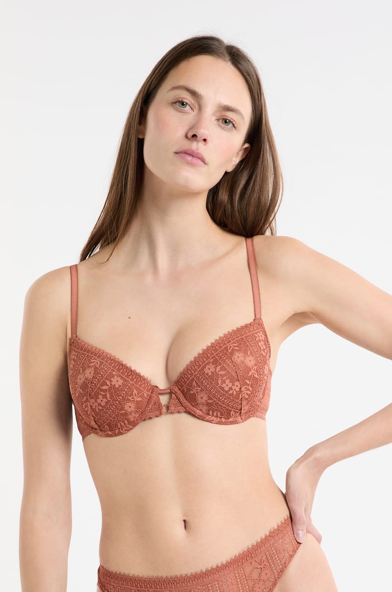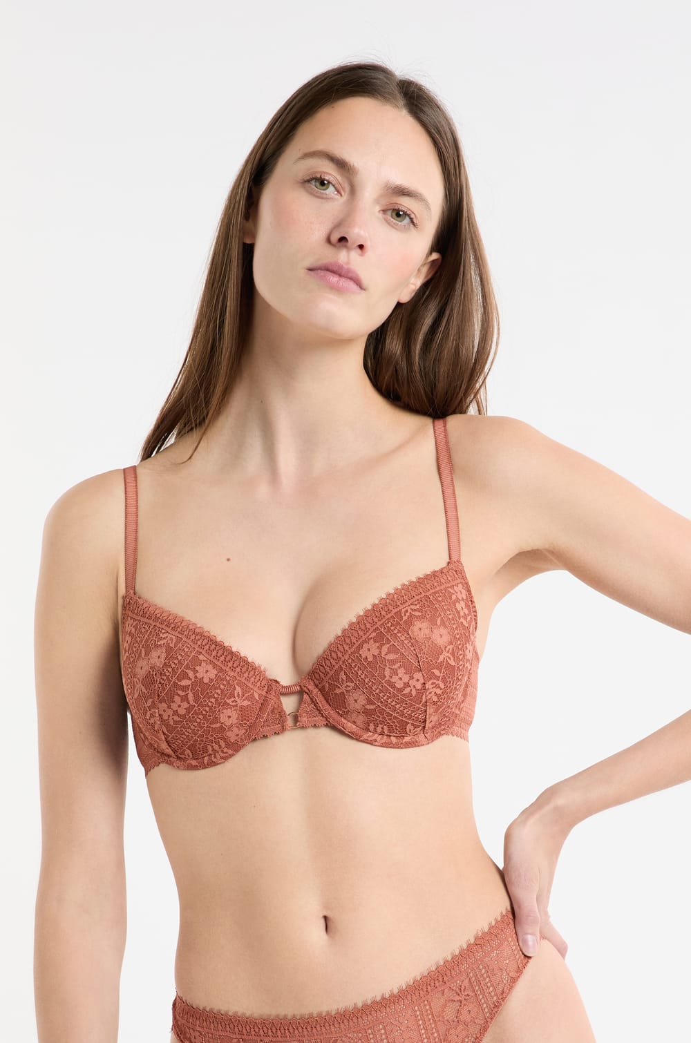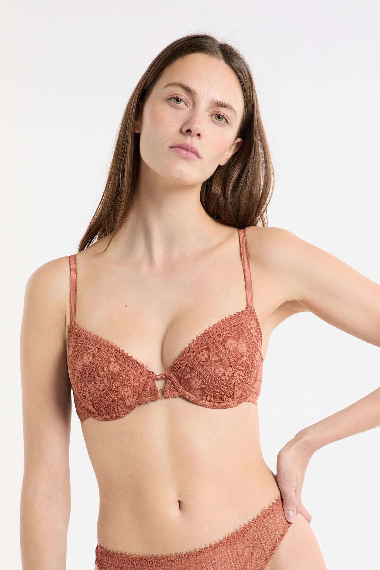 The eyelash effect lace of this bra combines floral motifs and graphic stripes. Its lightly lined cups naturally shape the neckline, whilst the ring at the centre front and the double straps at the back create an elegant piece.