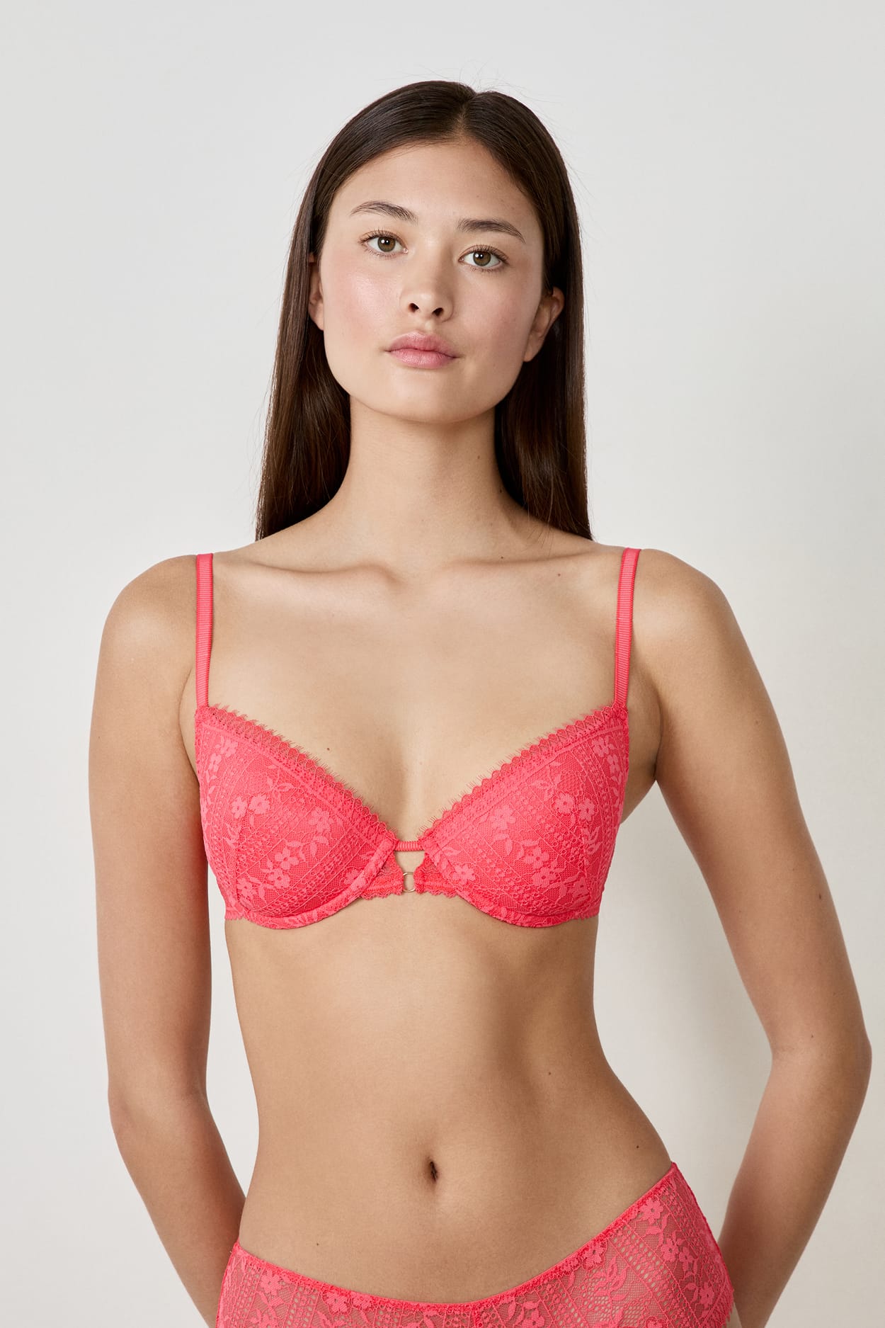 The eyelash effect lace of this bra combines floral patterns and graphic stripes.