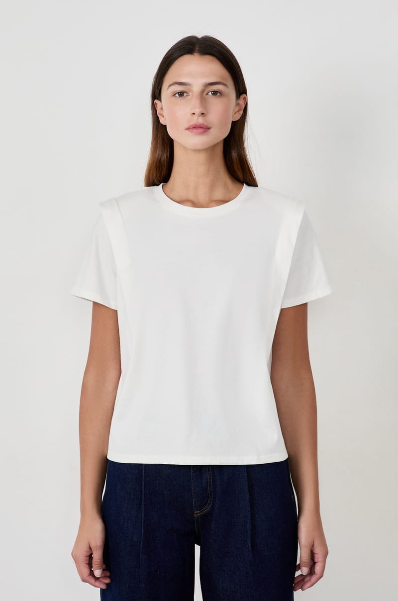 Ce T-shirt blanc en coton doux revisite le basique avec un twist au niveau des épaules pour créer un volume subtil et ap...