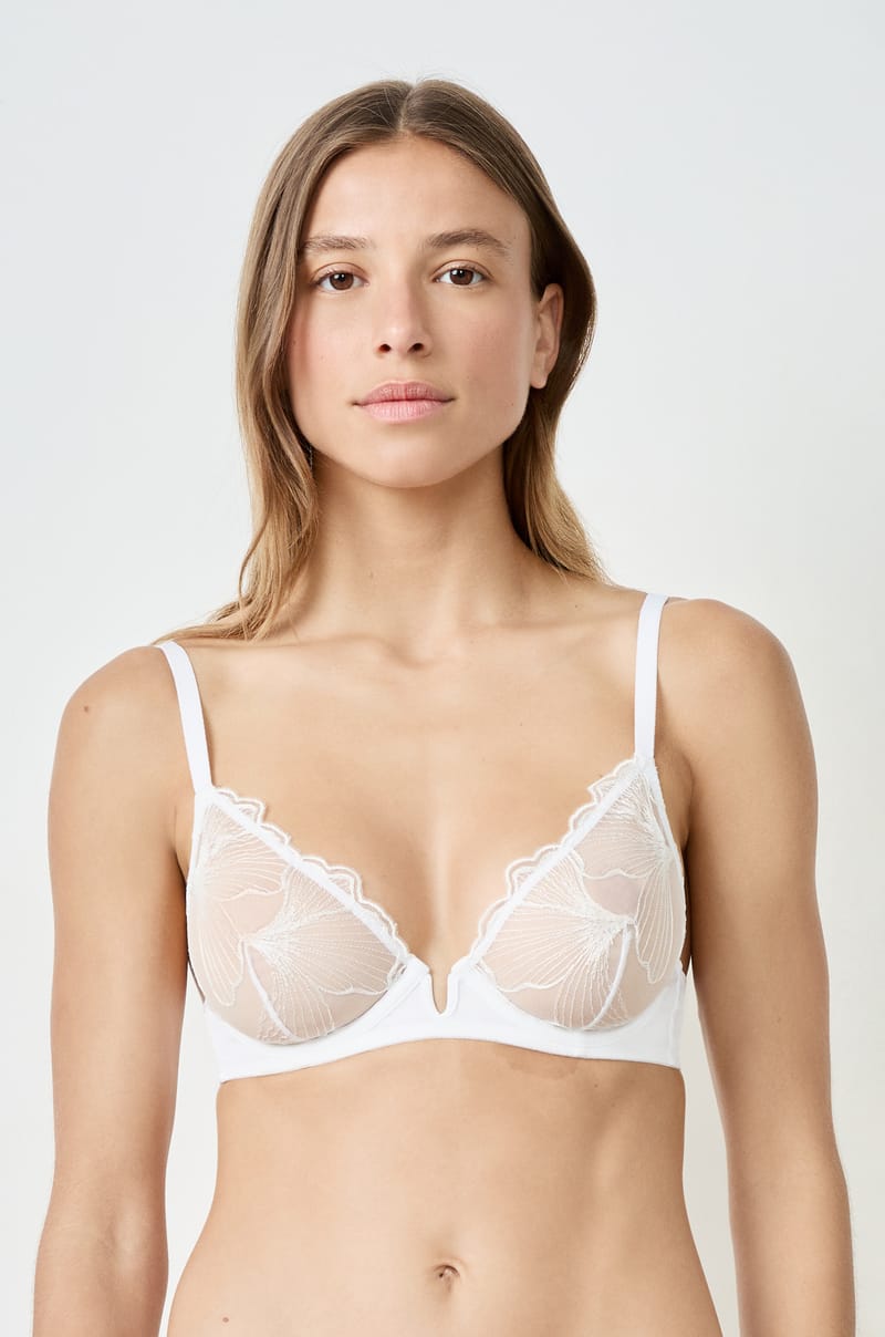 Our corsetry expertise is precisely expressed through this balconette bra, where floral embroidery delicately rests on t...