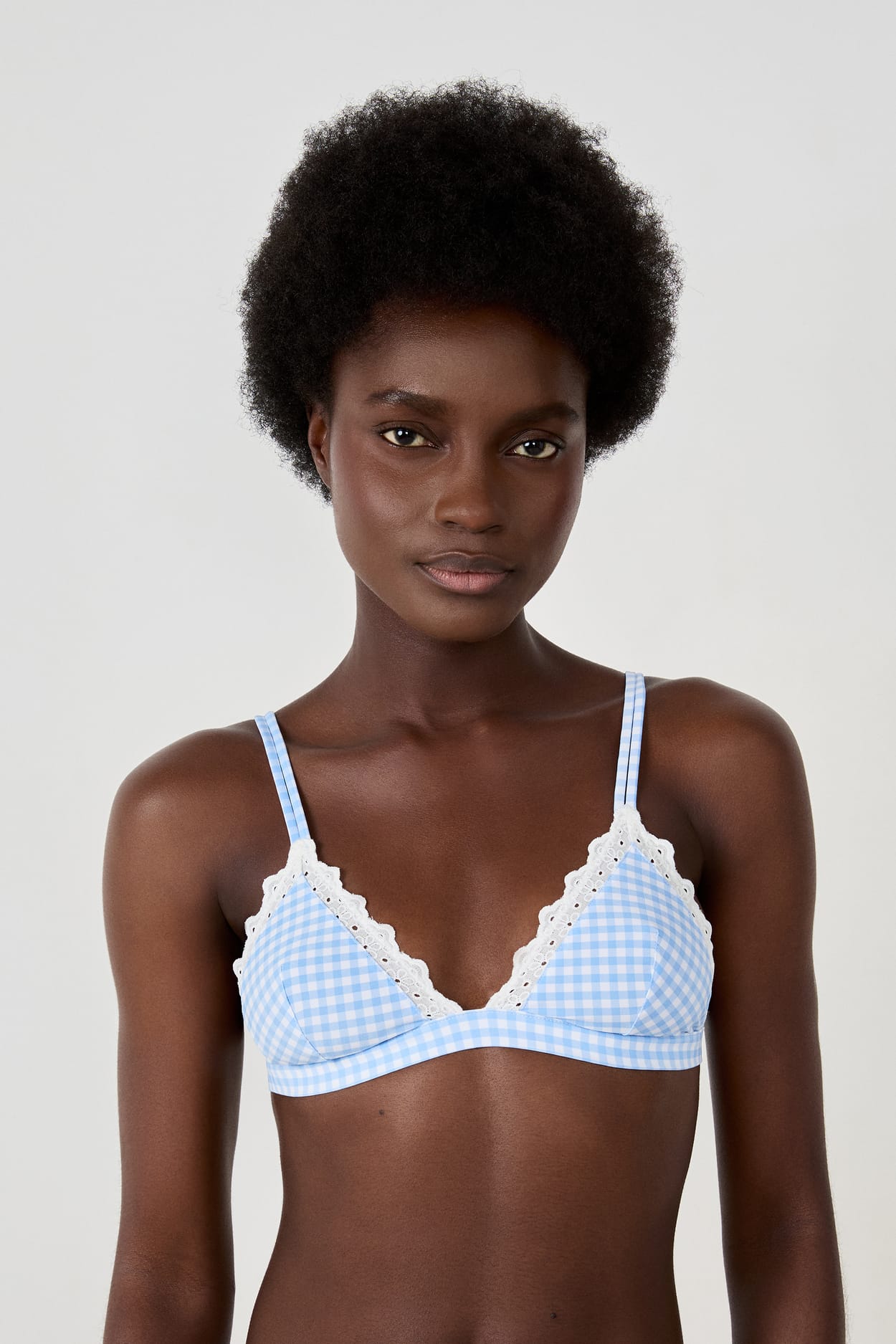 This triangle bra is adorned with irresistible details, combining a gingham print with English embroidery trim. Equipped...