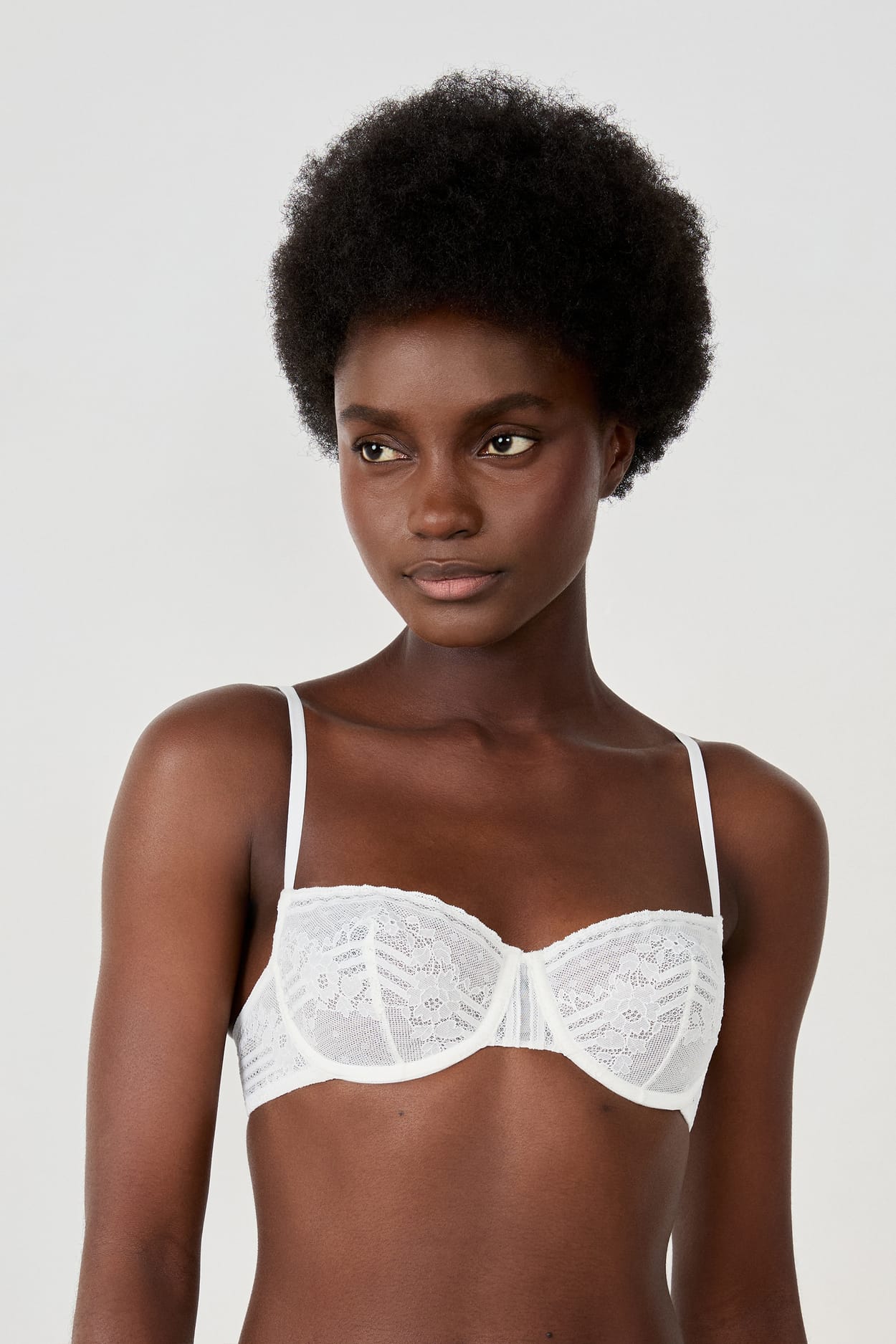 On this balconette bra, our corsetry expertise combines floral patterned tulle with an openwork graphic lace for added s...