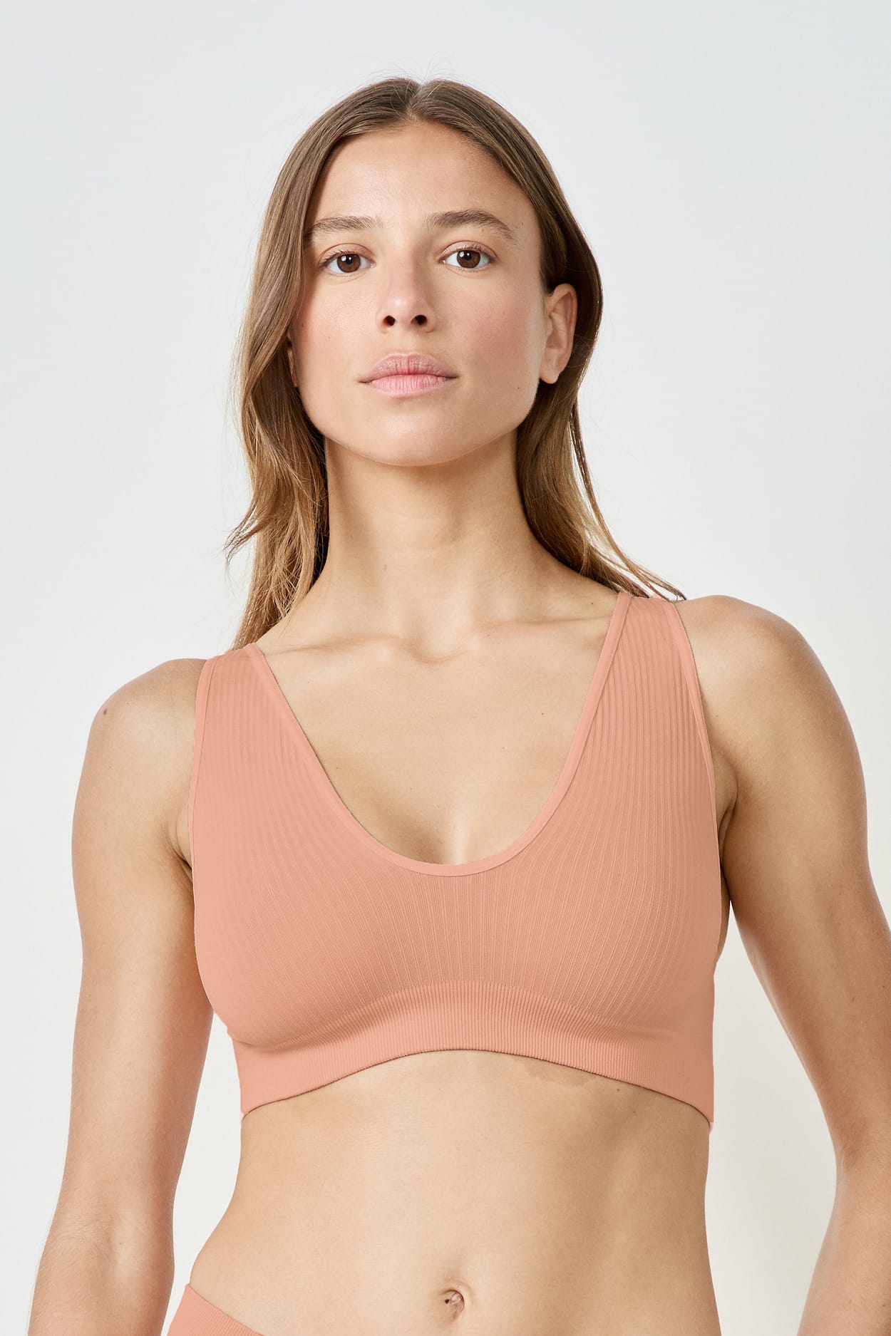 Seamless, this ribbed bralette reimagines everyday comfort.It features a plunging neckline and a round cut at the back. ...
