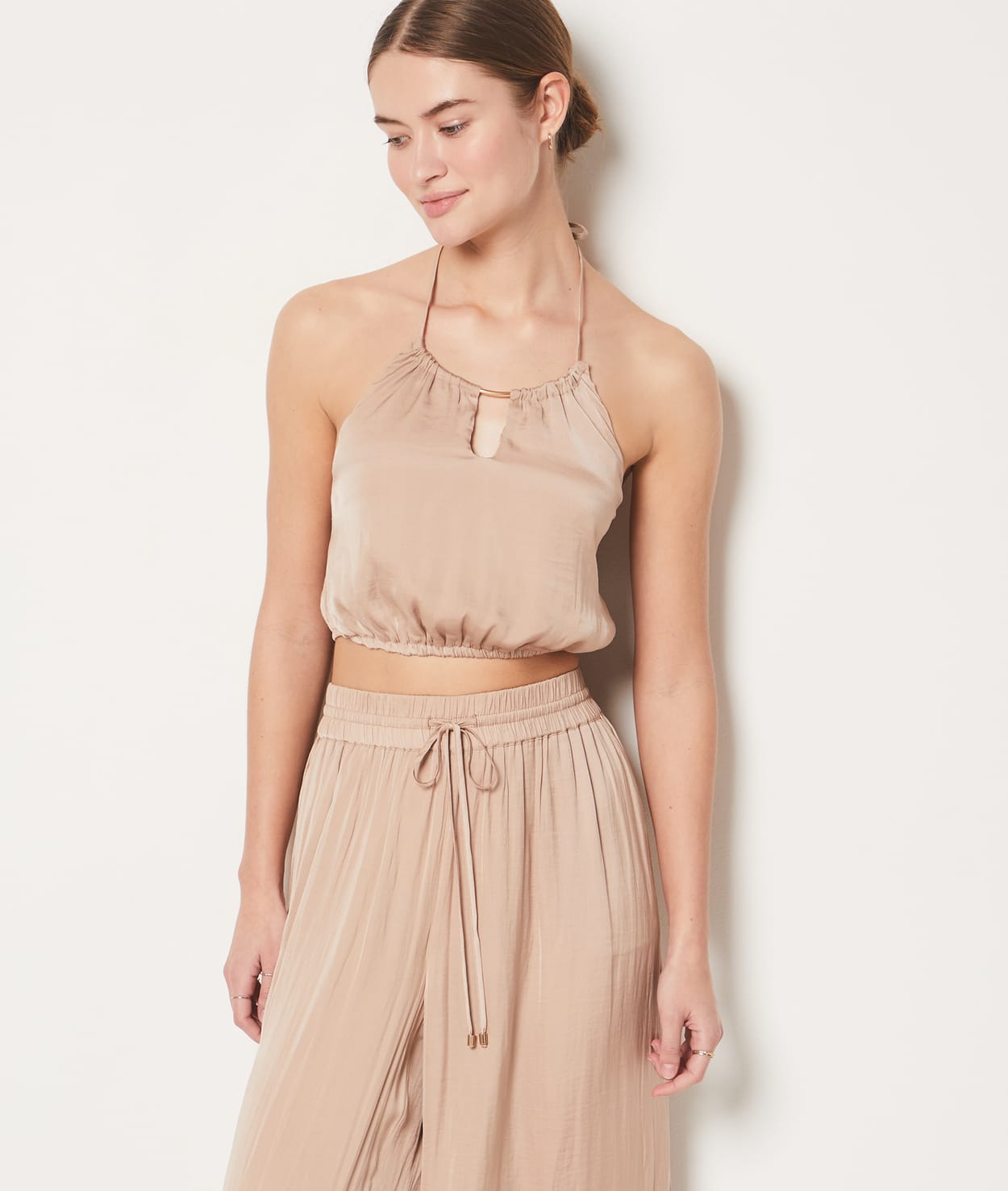 Delicately satin, this crop top features ties that fasten at the neck and an elasticated waist, revealing a smocked back.