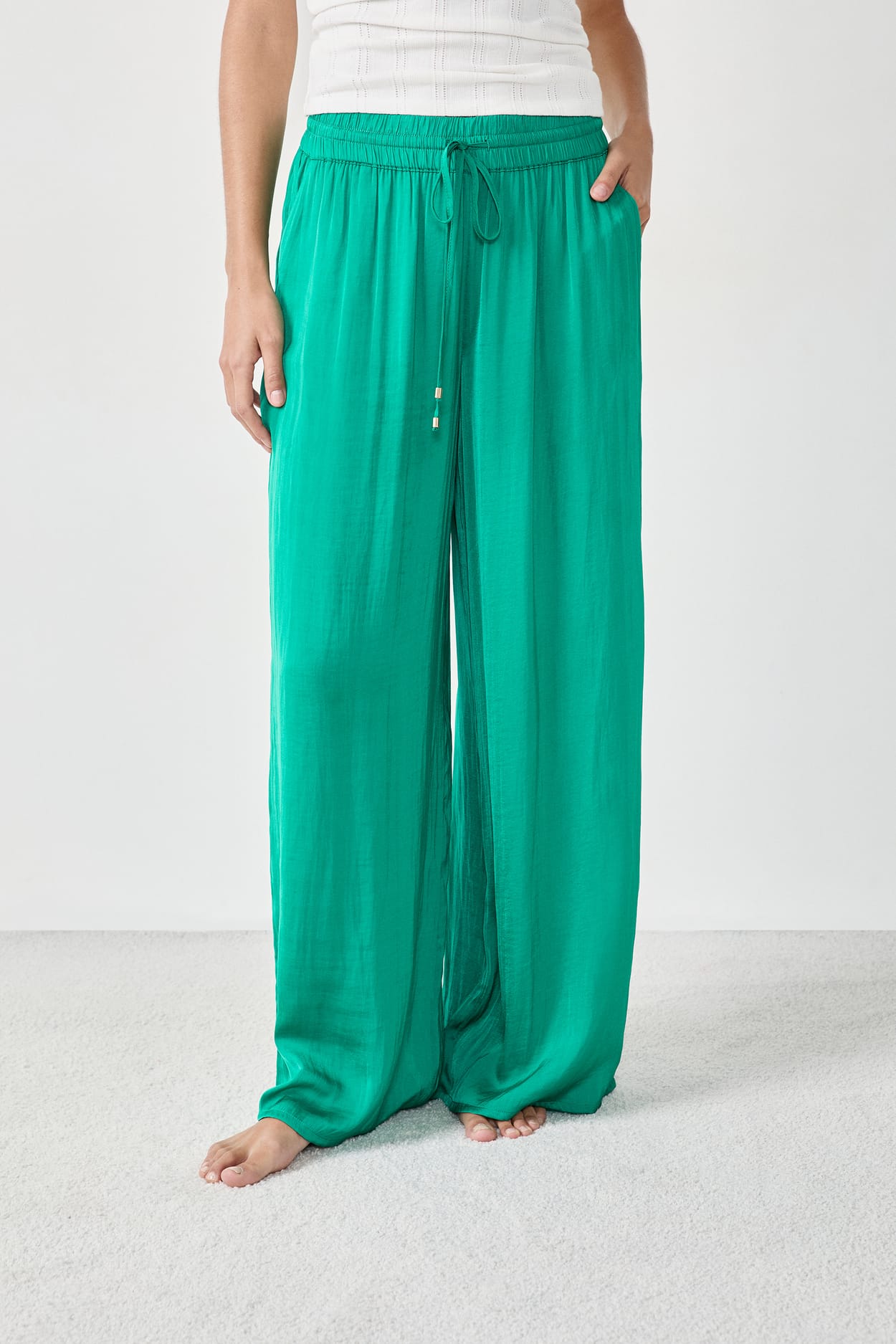 Delicately satin, these trousers feature drawstrings to tie around the waist and gathers. With its wide cut, it brings t...