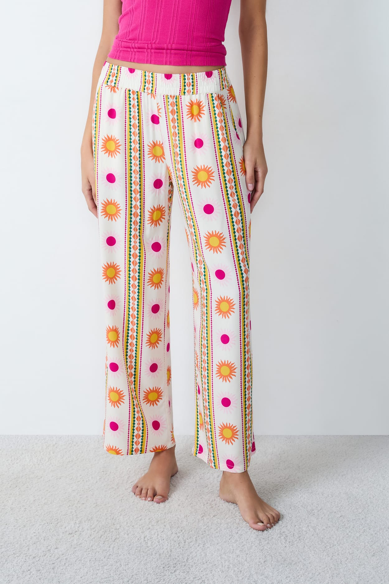 Adorned with graphic patterns and a sun print, these pyjama trousers combine comfort and elegance thanks to their elasticated waistband and flared cut.