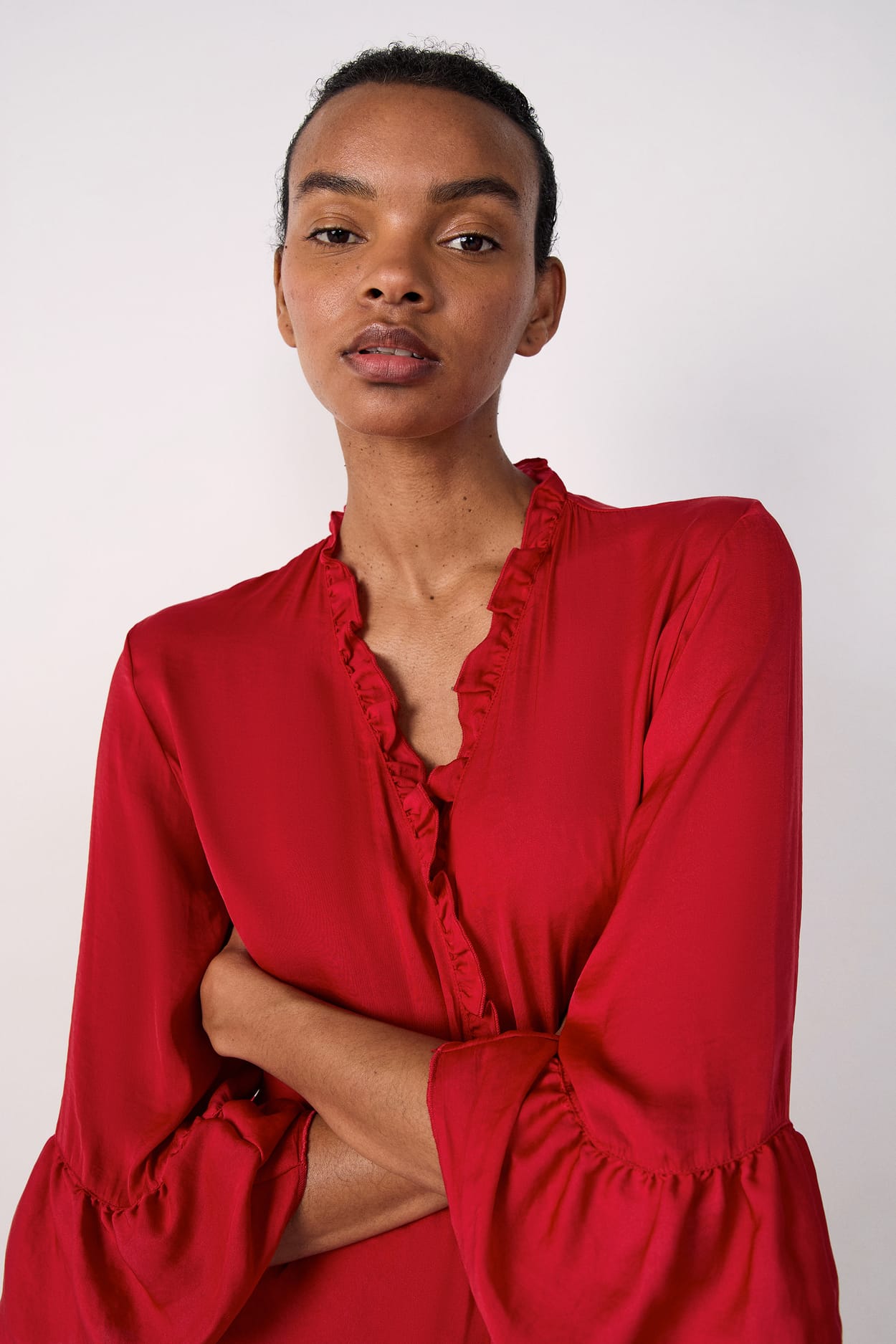 Délicatement satiné, ce déshabillé bordé de volants se glisse sur une lingerie sexy ou un ensemble de pyjama coordonné. Muni d'une ceinture à la taille il s'ajuste parfaitement.