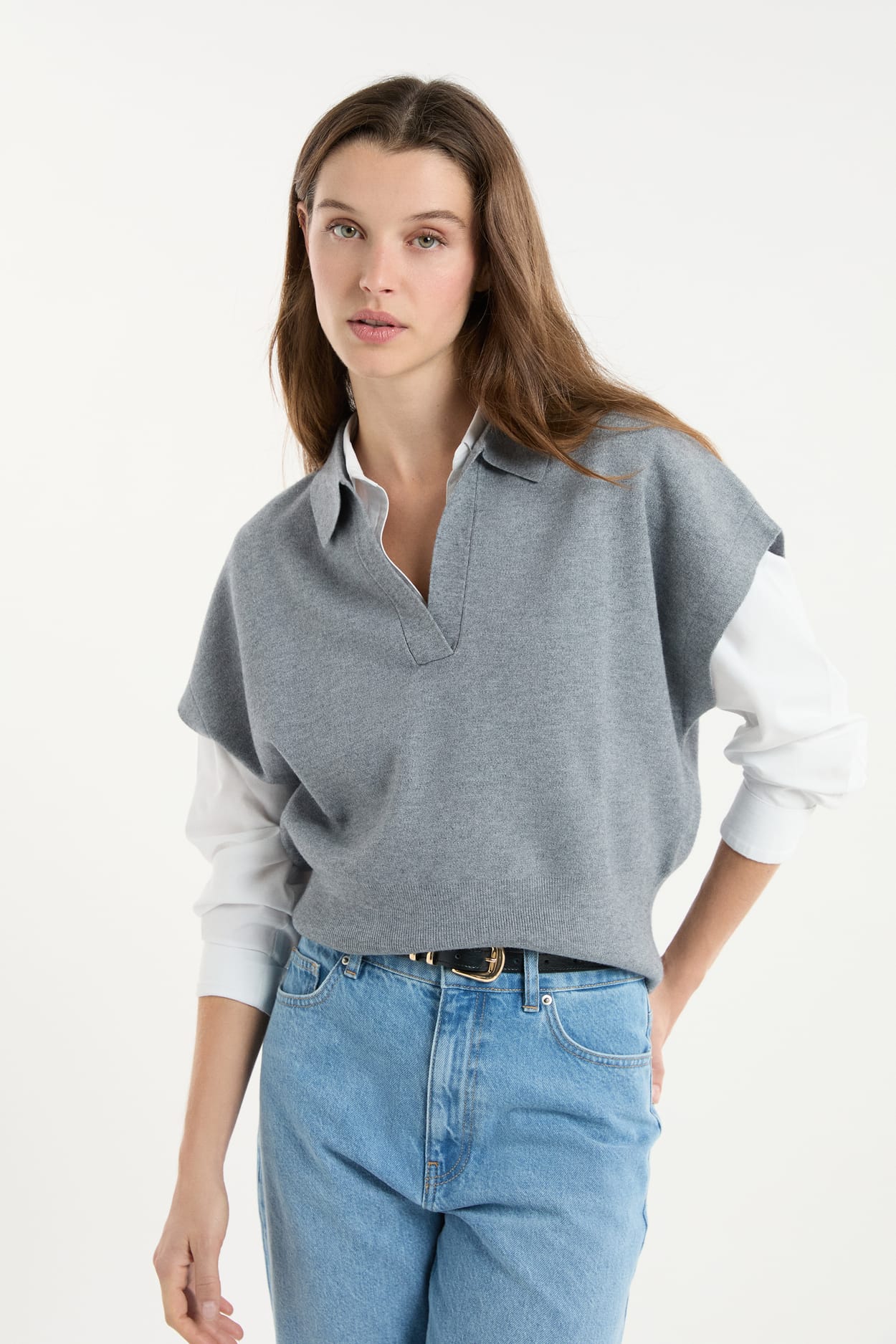 A wardrobe essential, the polo is reimagined as a sleeveless sweater. Made in knit, it opts for a wide cut and pairs eas...