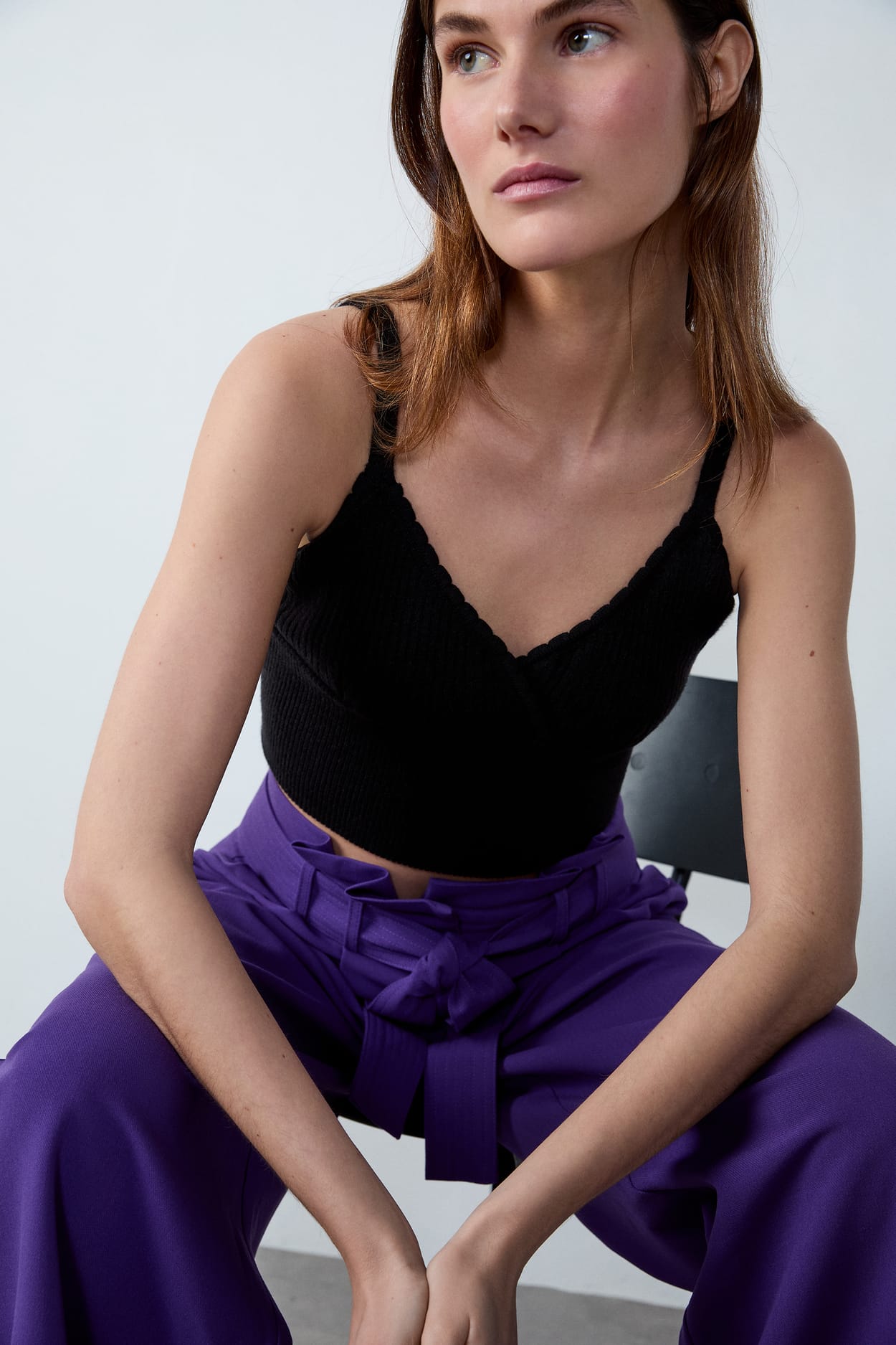 With straps and a V-neck, this ribbed knit crop top accentuates the waist and can be worn in the city or at the beach....