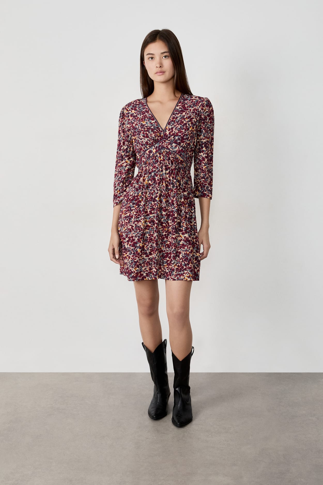 Short dress with floral patterns;${refinementColor}