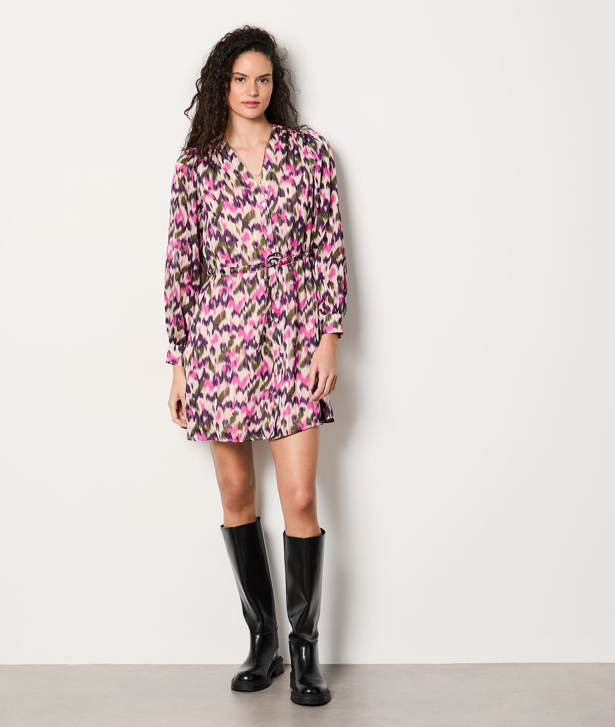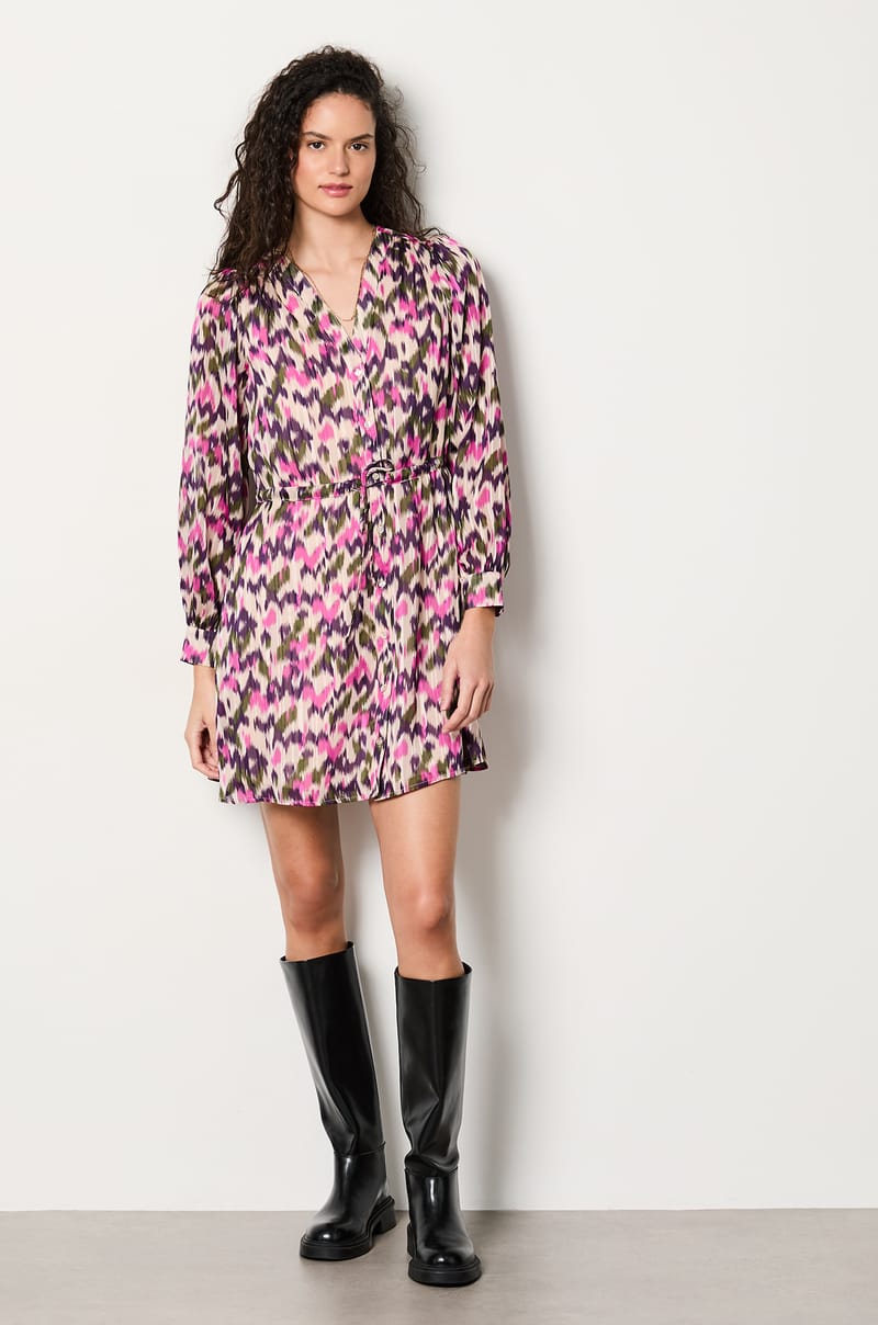 Fluid and light, this long-sleeved dress accentuates the waist with adjustable ties. A colourful piece to accessorise an...