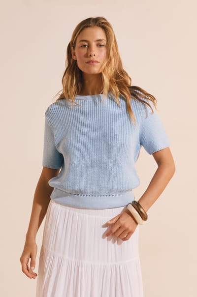 Short-sleeved polo in fine pointelle knit;${refinementColor}