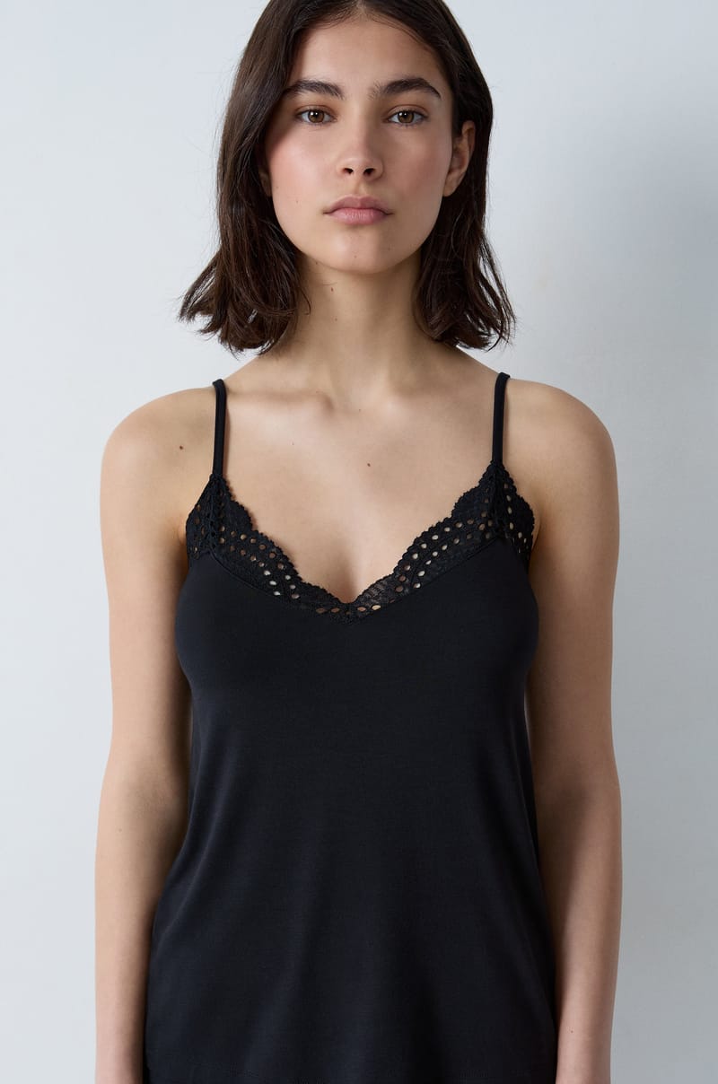 Opt for soft nights with this modal camisole. Featuring thin adjustable straps, it displays a subtle neckline bordered with lace in graphic patterns.