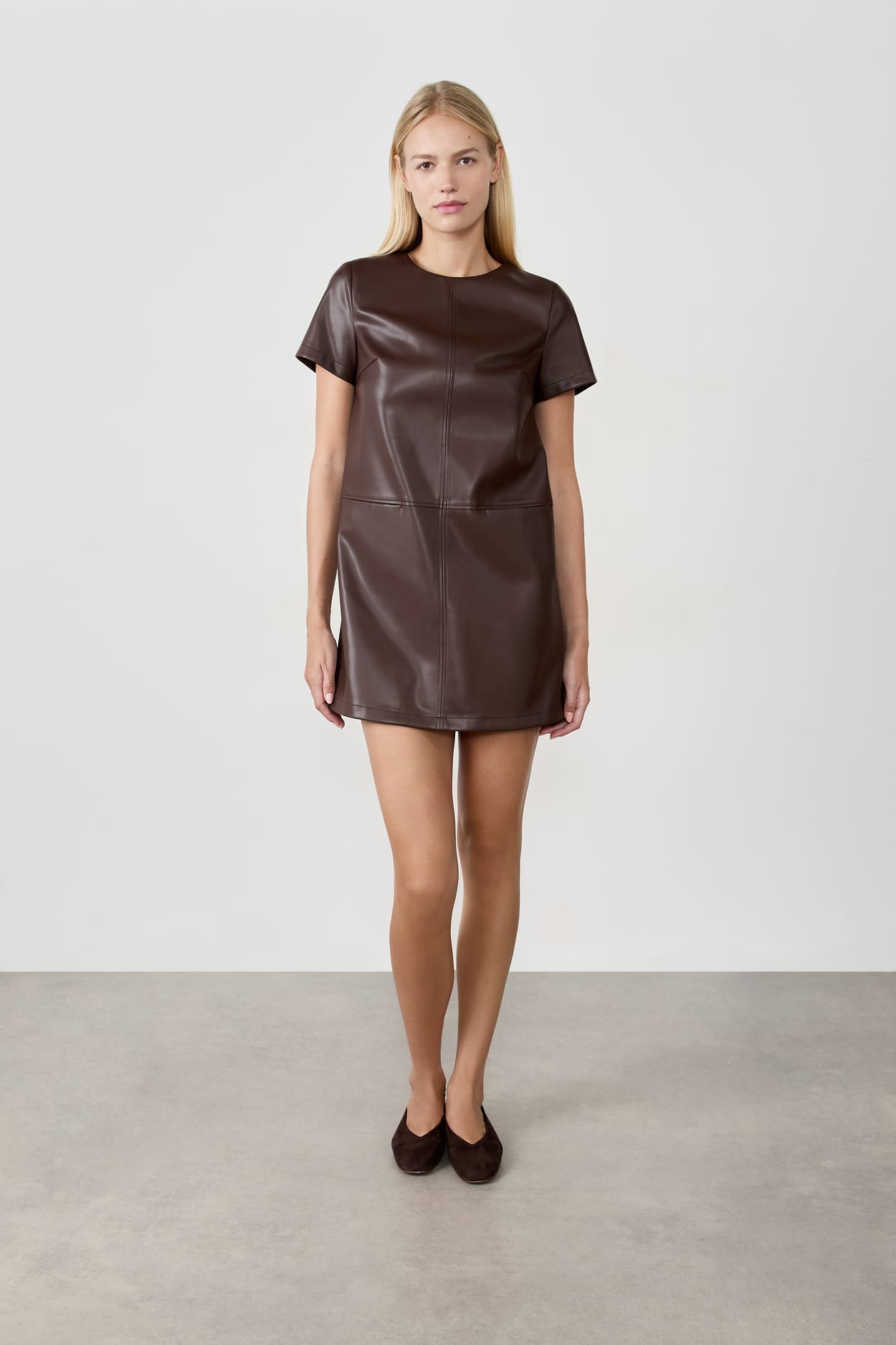 Perfect for a sleek and elegant look, this leather-effect dress features short sleeves and a round neck....