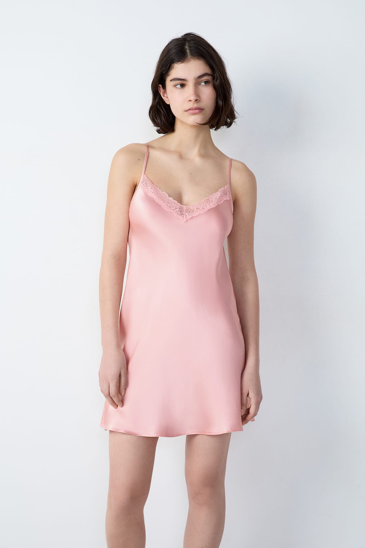 Subtly adorned with floral lace, this nightdress combines delicacy and sensuality.