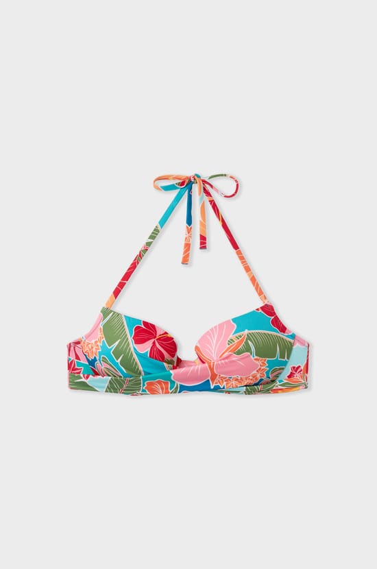 • Strapless lightly lined bra with removable straps iridescent swimsuit top;${refinementColor}