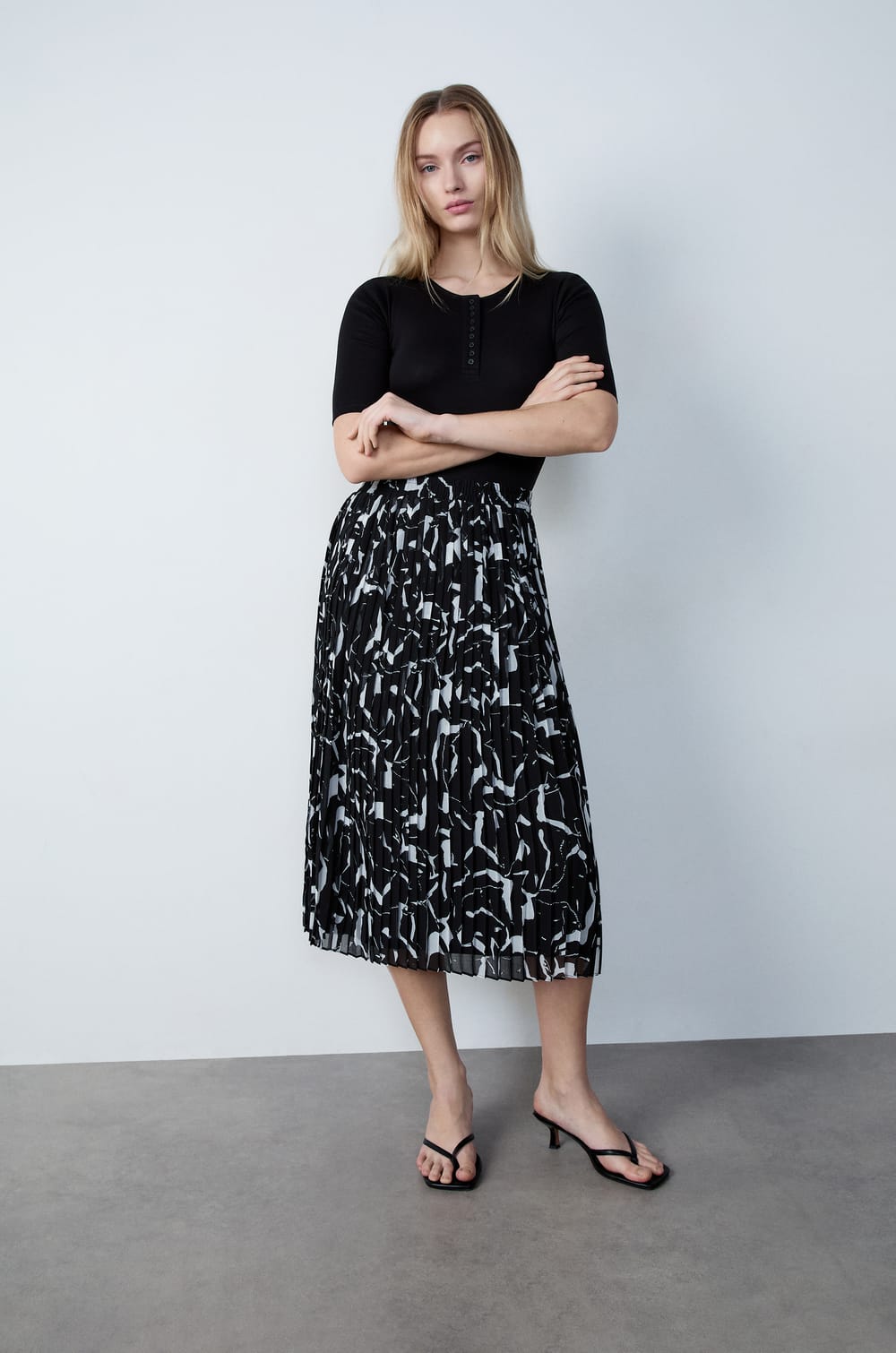A timeless piece, the long skirt is adorned with an original graphic pattern. Its pleated cut creates an airy silhouett...