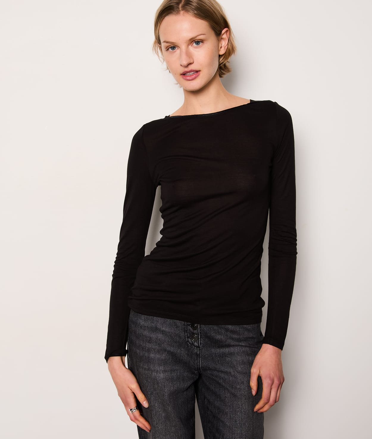 A true revisited basic, this long-sleeved boat neck t-shirt offers multiple styling possibilities....