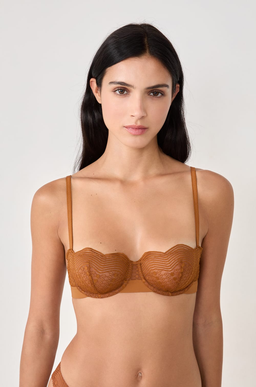 Our corsetry expertise reveals a balconette bra in openwork lace, enhanced by subtle polka dot prints and graphic lines....