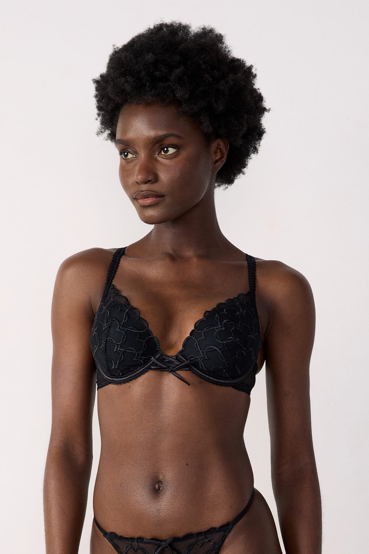 Heart-shaped embroideries are subtly outlined on this plunging push-up bra, constructed with cups and underwires. It creates a plumped neckline and reveals a satin bow between the cups.
