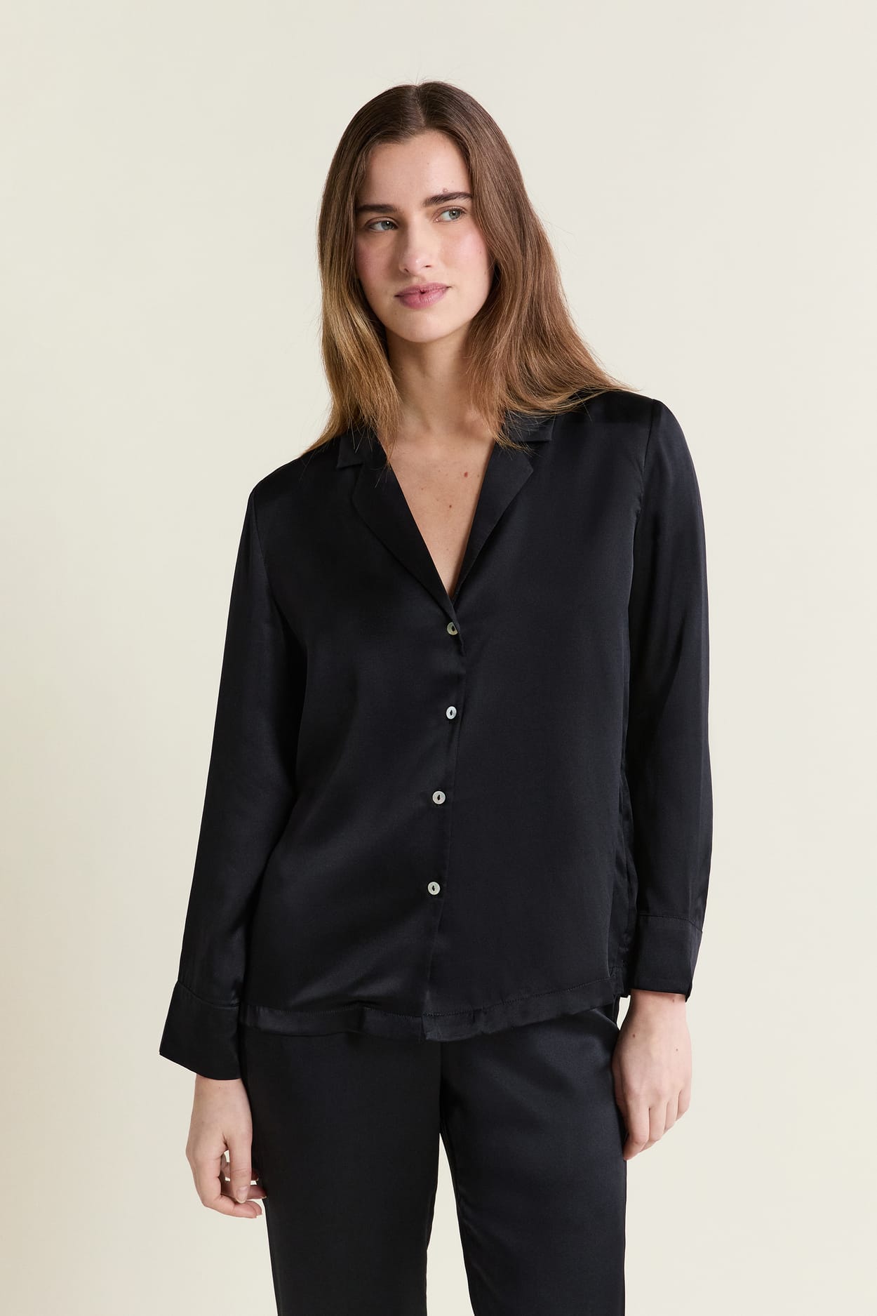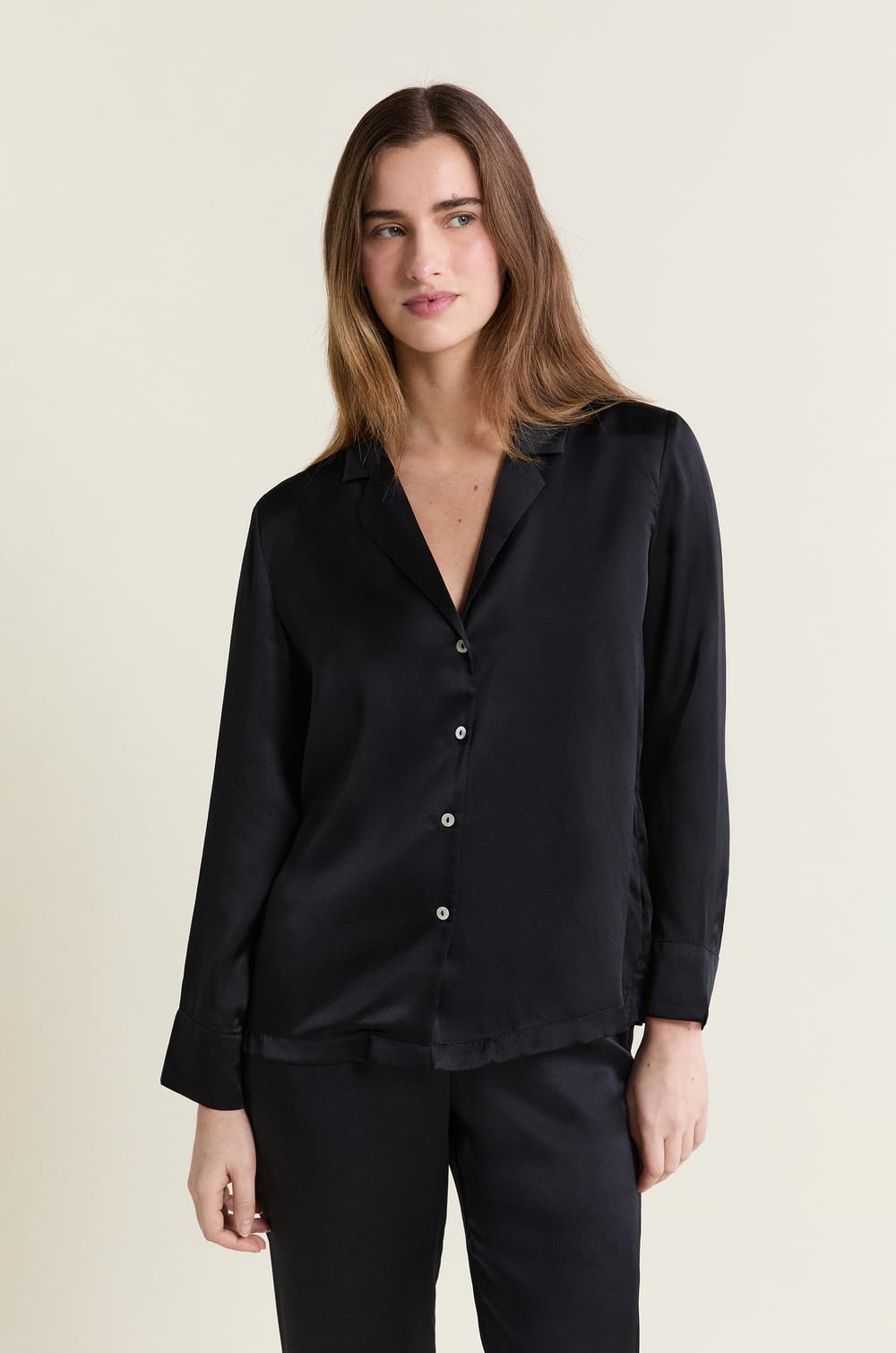 Fluid and light, this silk pyjama shirt enhances the neckline and adds a touch of elegance to your chic nights....