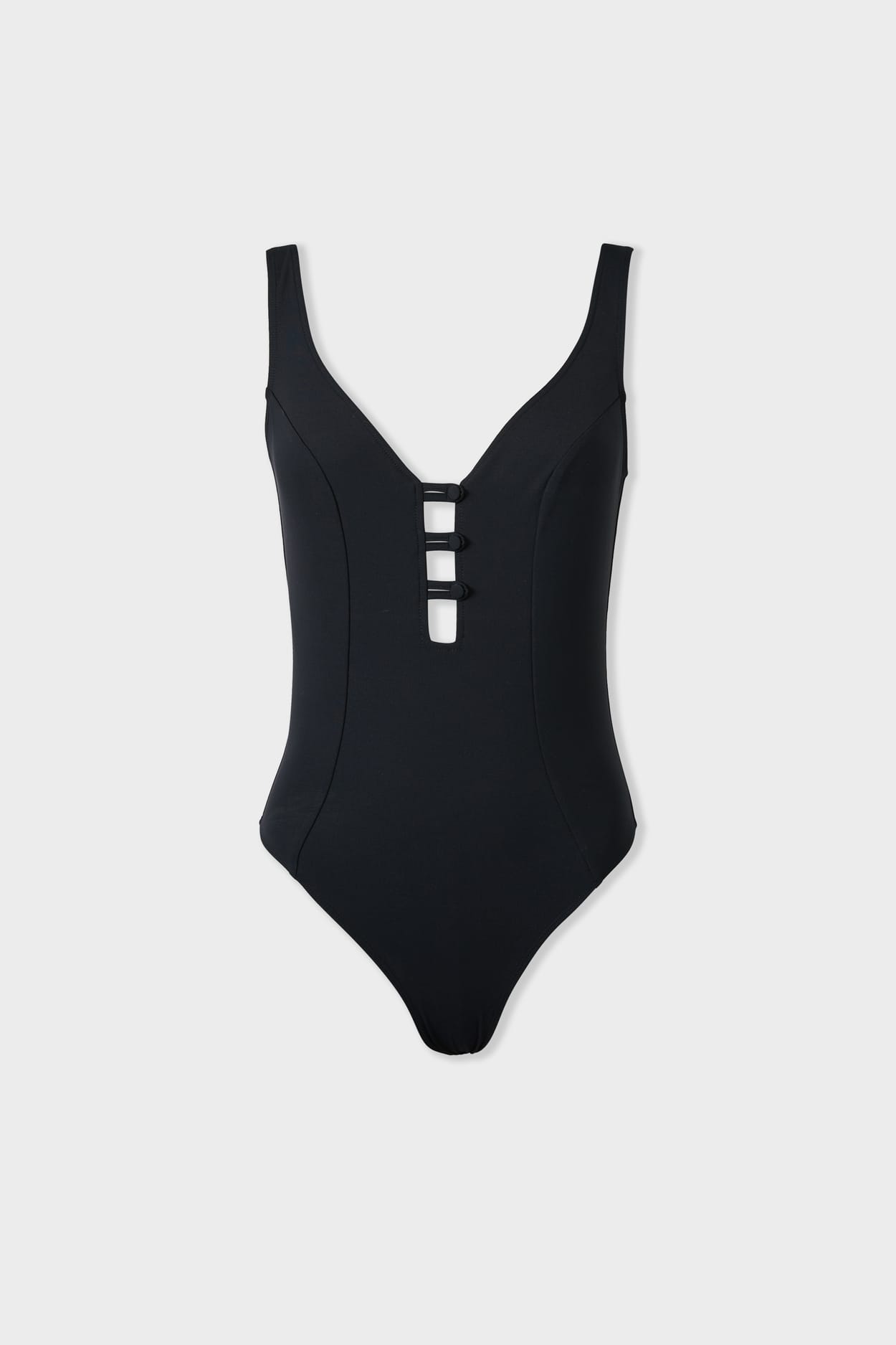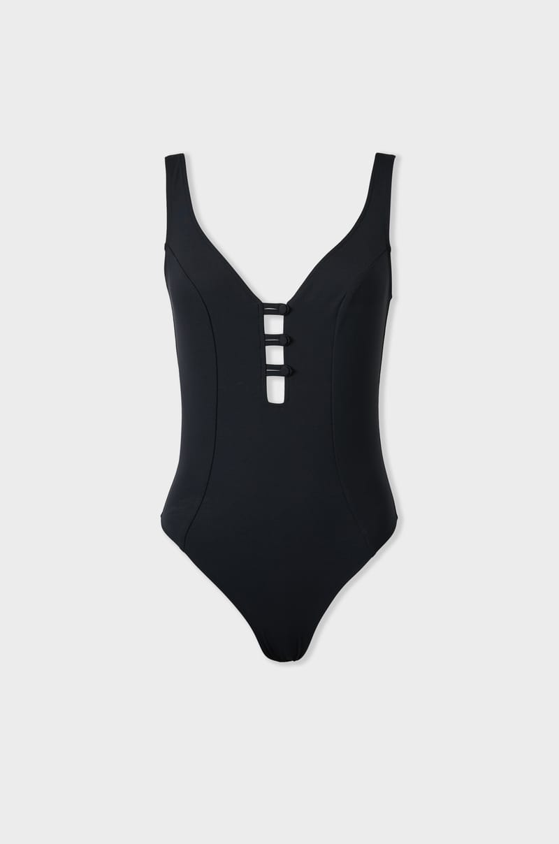 La figura se esculpe y sublima en este bañador de una pieza con escote en V y espalda redondeada. Confeccionado con tejido italiano reciclado sin copas ni aros, este bañador es un imprescindible de la colección. ¿La firma de Marcia Wear? Delicados cierres de botones cubiertos, sutilmente colocados en el hueco del escote, que revelan un poco más de piel.