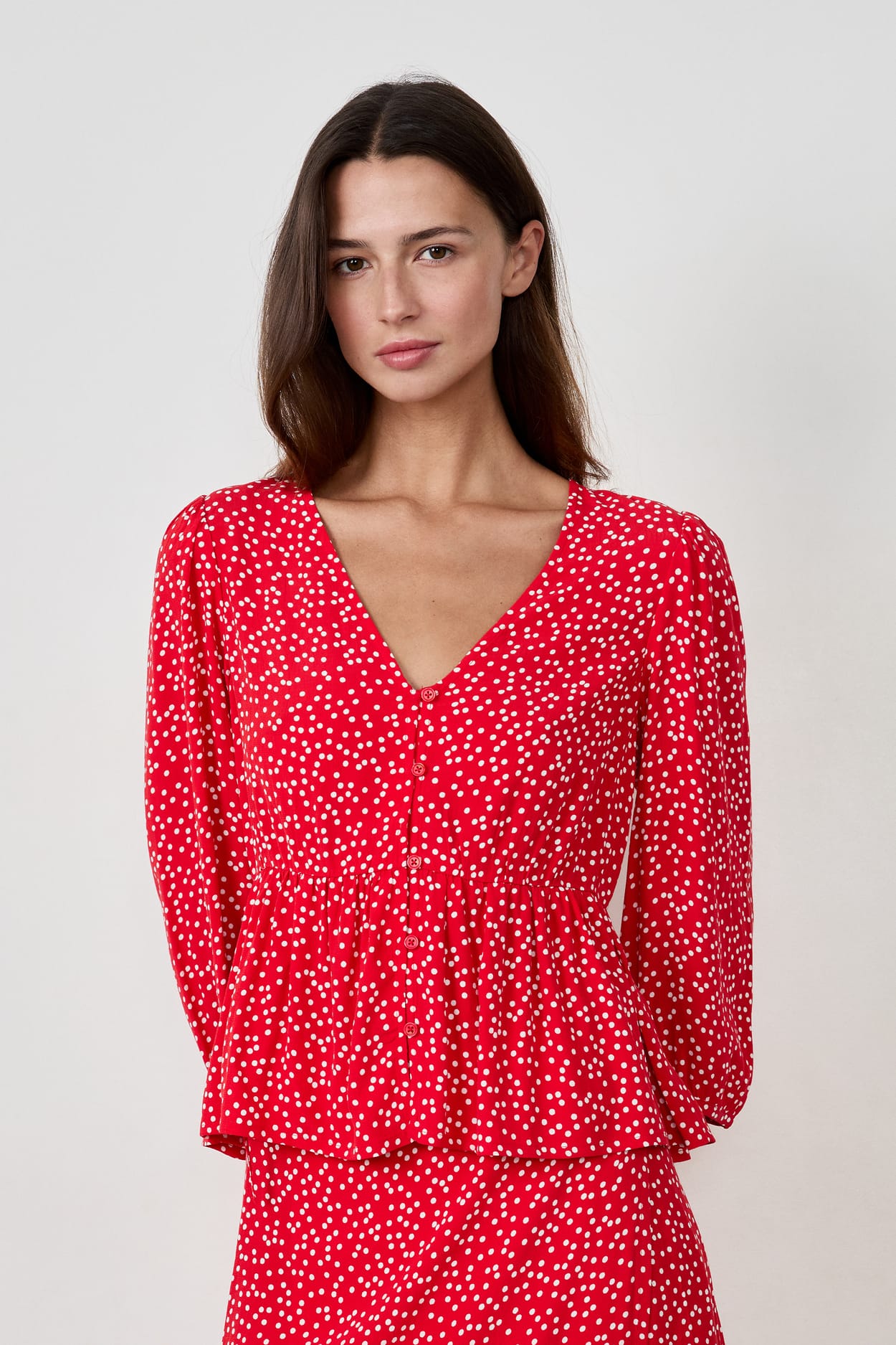 Cette blouse à pois signe une allure raffinée avec sa coupe légèrement cintrée à la taille. Elle est munie de manches longues et d'une ouverture boutonnée.