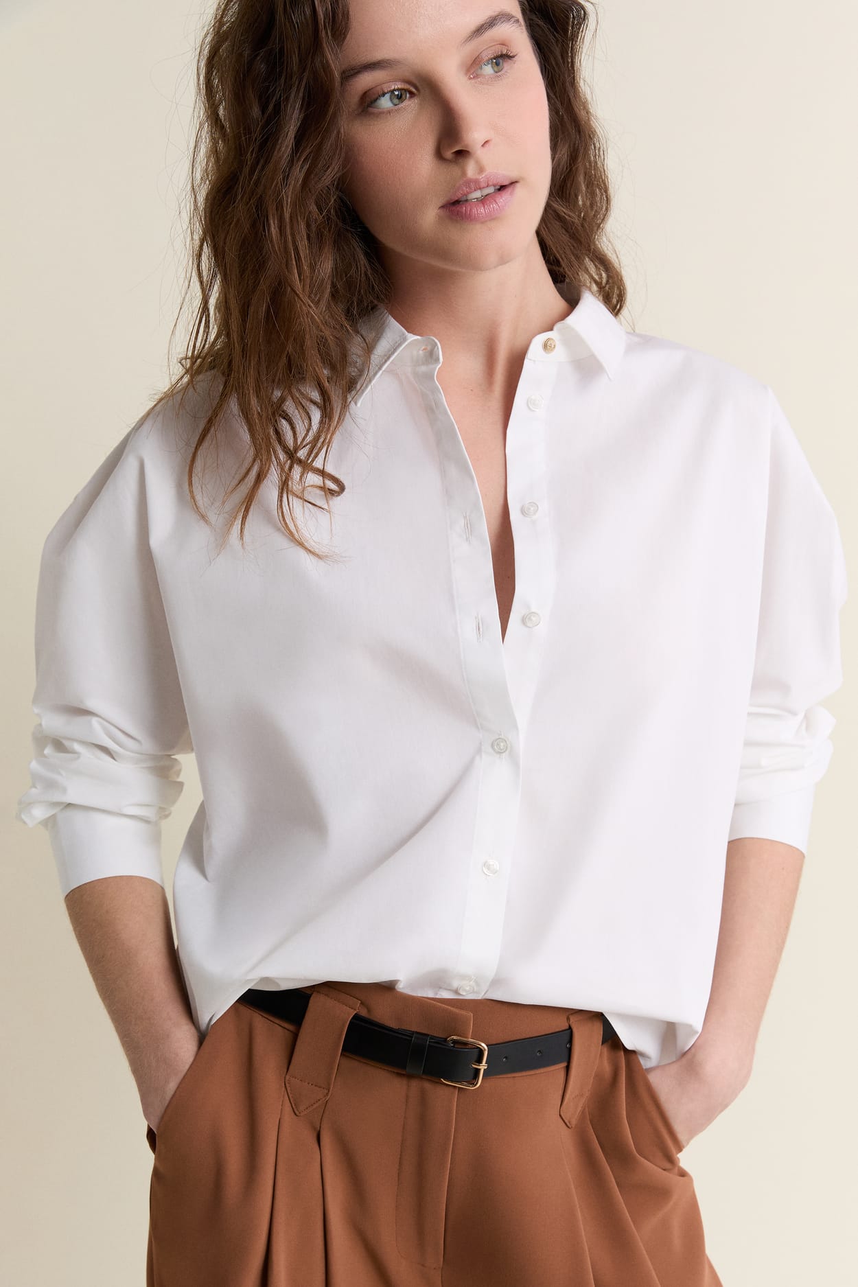 100 % suavidad y elegancia, esta camisa de algodón blanco ofrece un corte fluido ideal para un estilo desenfadado, a la vez que garantiza una comodidad óptima para el día a día.