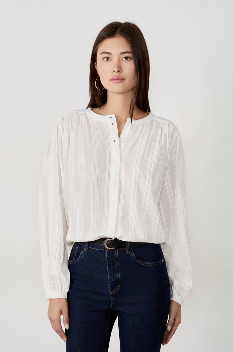 Idéal pour un look chic et subtil en toute saison, cette chemise manches longues à col rond est un basique revisité. Avec sa fermeture boutonnée et ses broderies verticales elle apporte texture et élégance.