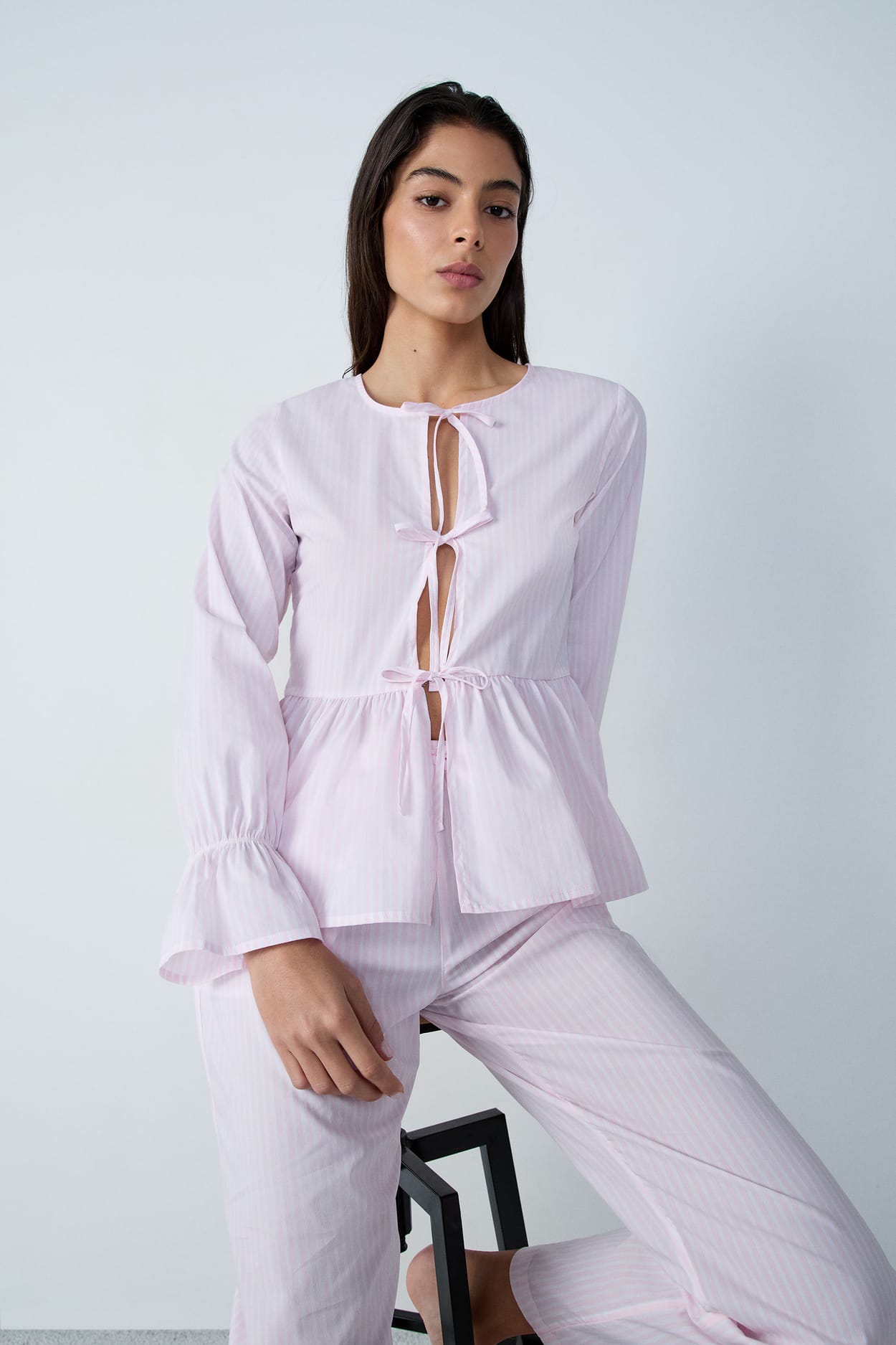 Rayas y pequeños lazos, esta camisa a rayas con volantes es una de las piezas estrella de la colección. Como pijama con el pantalón a juego, o durante el día con unos jeans, es una prenda versátil que se adapta tanto para dentro como para fuera de casa.