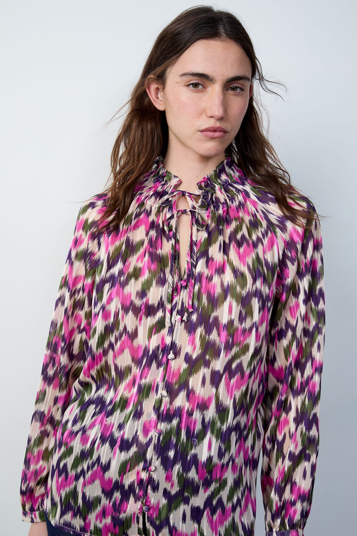 Adornada con motivos gráficos, esta camisa con cuello clásico crea una silueta ligera y aérea gracias a sus lazos para atar en la parte delantera.
