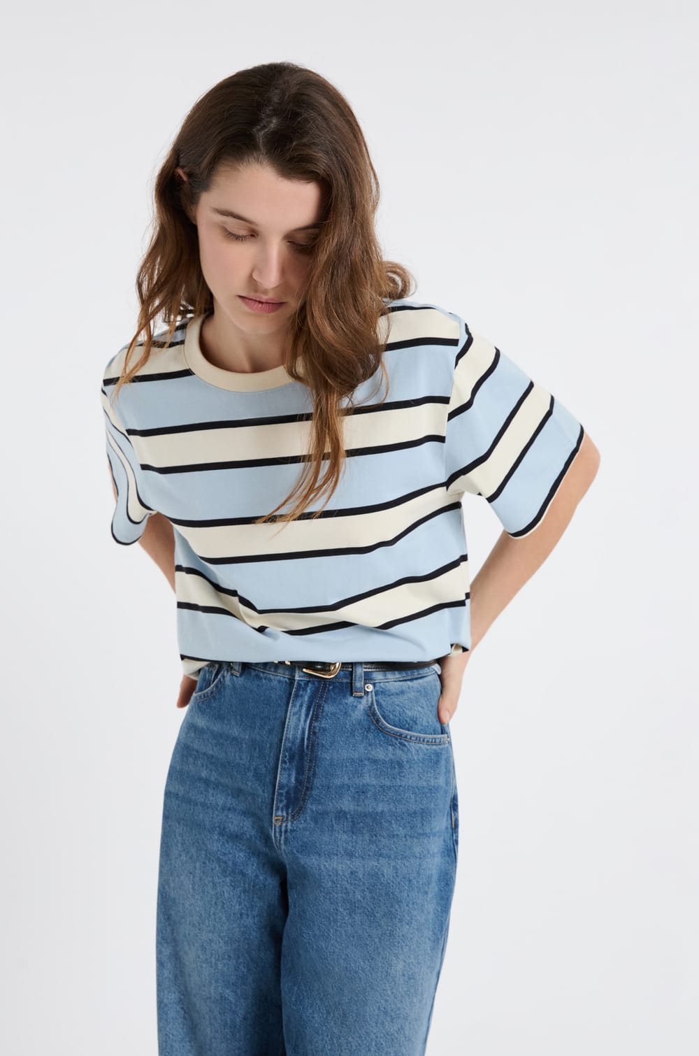 Ce t-shirt en coton s'habille de rayures. Il est muni de manches courtes et d'un col rond. Il se porte avec un jean pour un look moderne et confortable.