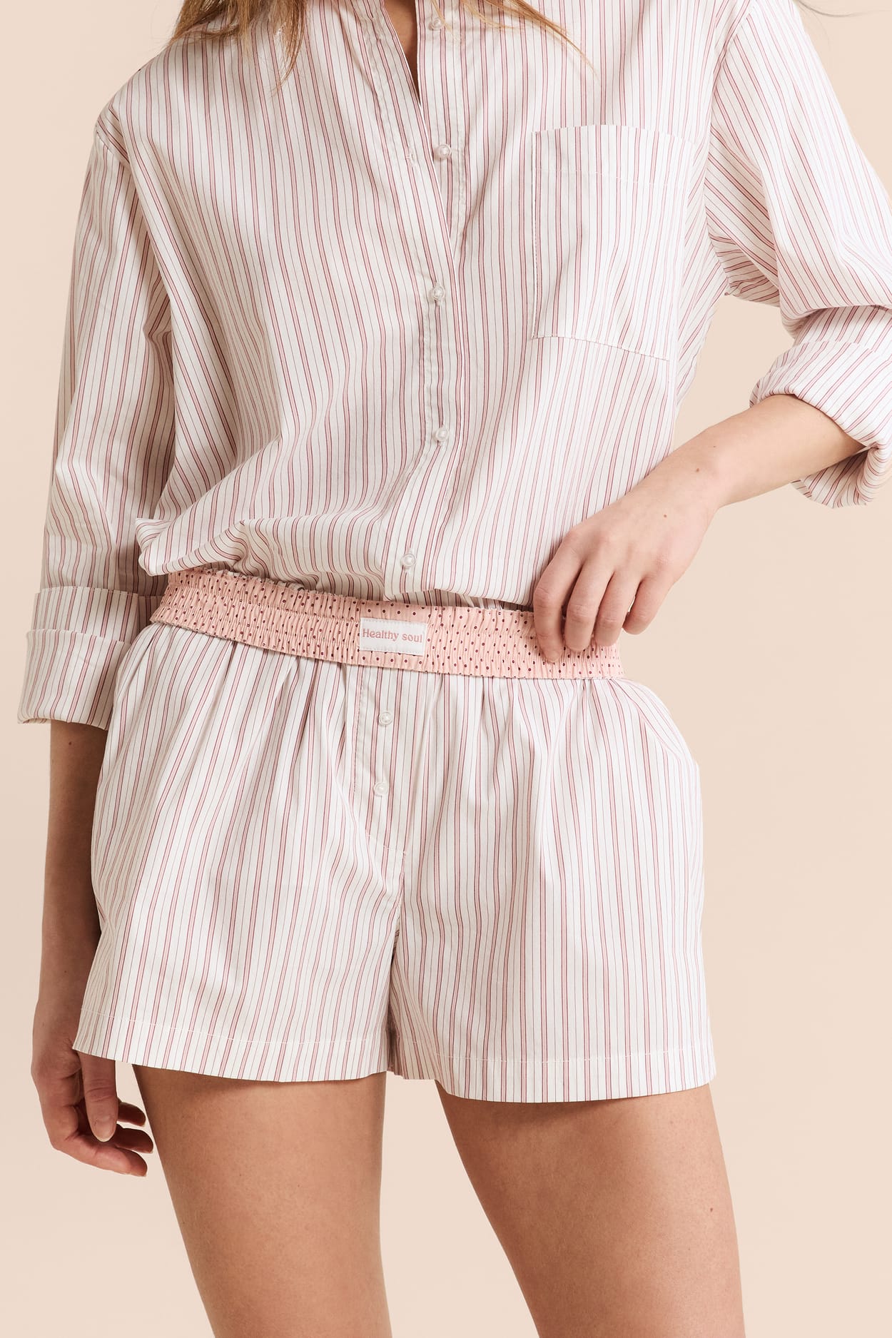 100 % suaves y ligeros, estos pantalón cortos de pijama de algodón garantizan una comodidad óptima para noches tranquilas gracias a su corte acampanado y sus delicadas rayas.