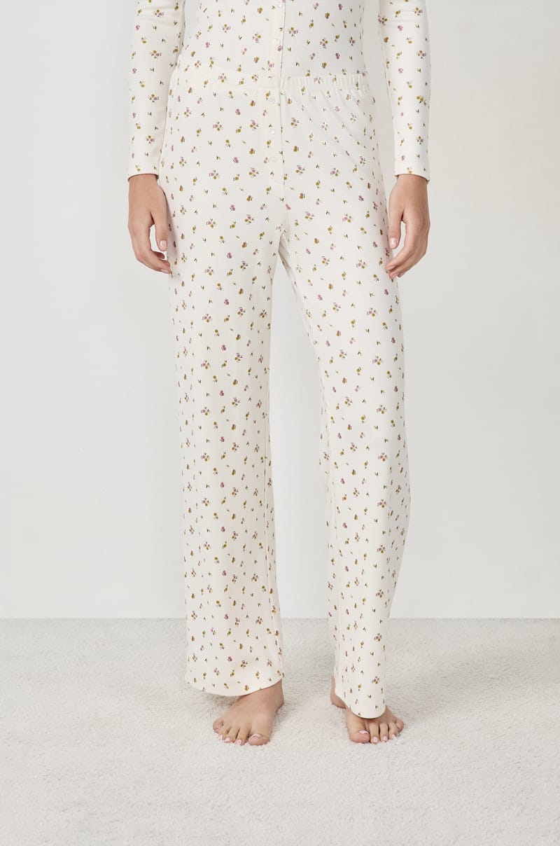Basique intemporel du vestiaire de nuit, le pantalon de pyjama est revisité avec un motif fleuri et une fermeture boutonnée.