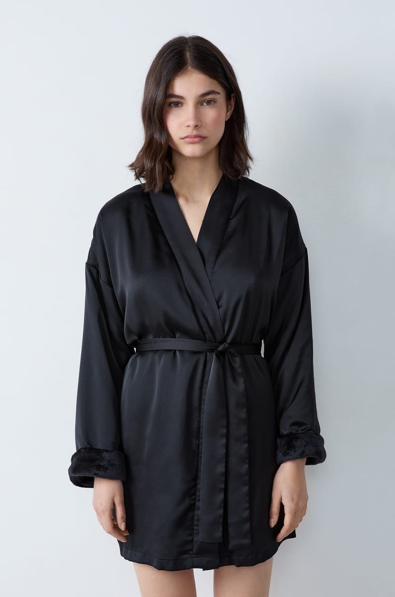 Con un delicado acabado satinado, este elegante picardías esconde un forro polar.... para ofrecer un capullo cálido y elegante.