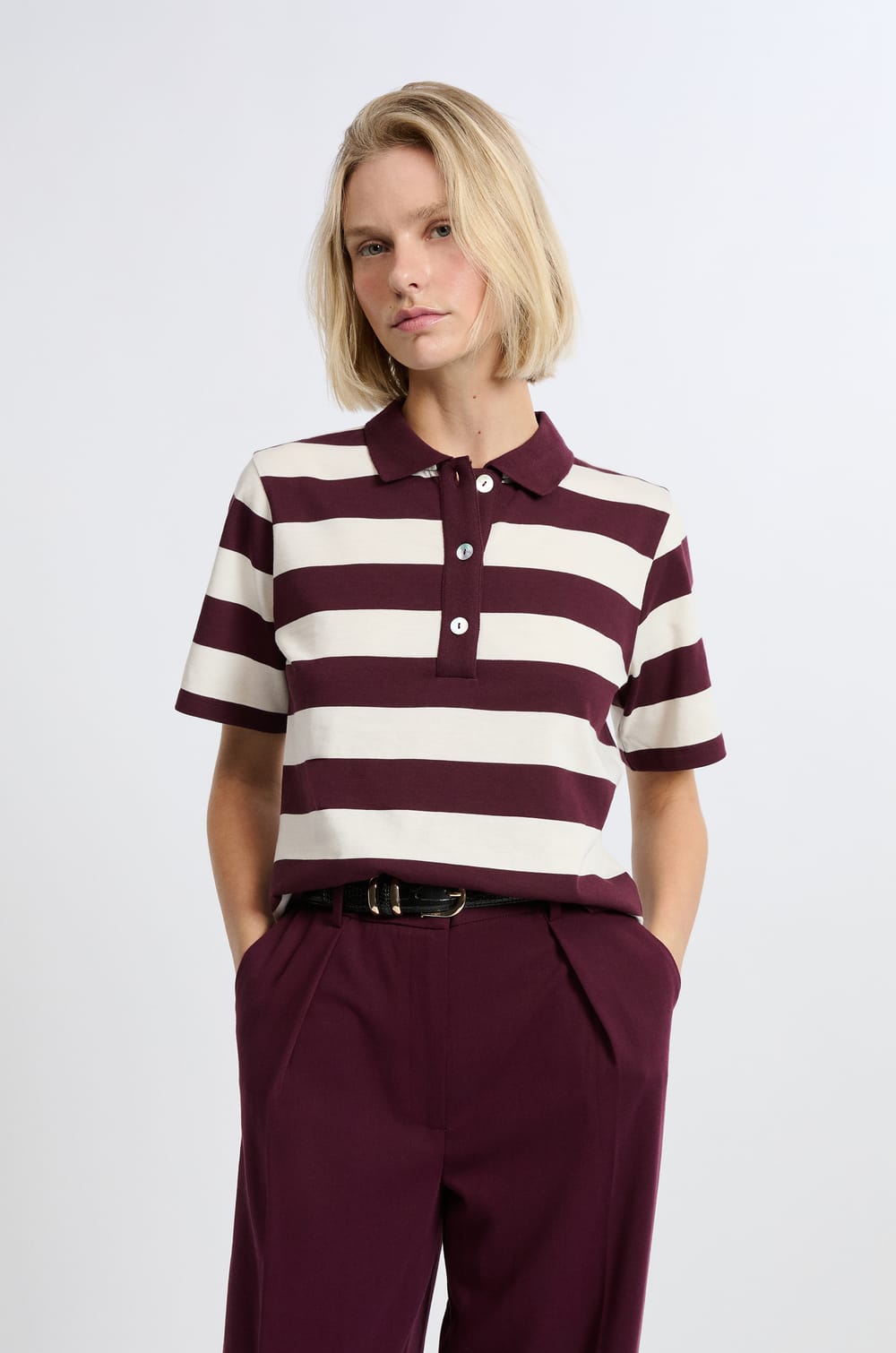 Estampado estrella de la temporada, este jersey de manga corta se viste de rayas. Cuenta con cuello polo y tapeta con botones dorados.