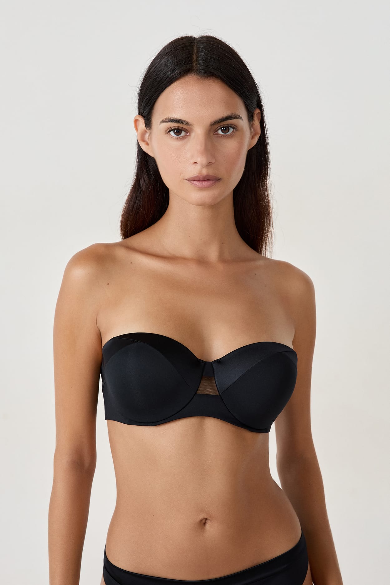 Perfecto bajo un corpiño o un vestido de tirantes finos, este sujetador bandeau de copas finas realza el busto al tiempo que garantiza una sujeción óptima. Con aros, detalles transparentes entre las copas y tirantes desmontables, se adapta a todos los caprichos.