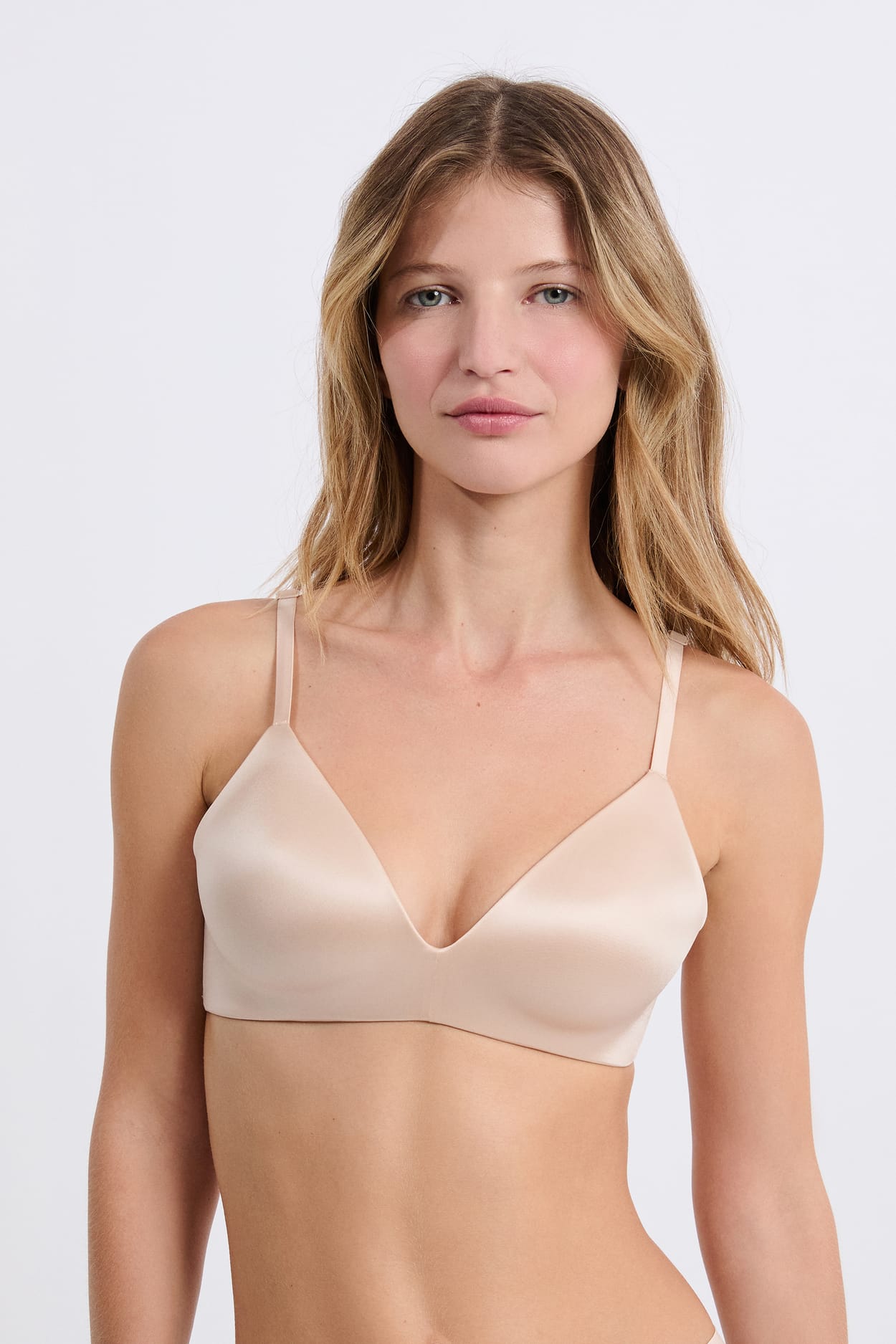 Conçu en microfibre délicatement satinée, ce soutien-gorge triangle sans armatures réinvente l’invisible avec un subtil effet brillant. Il se fond sur la peau avec un glow délicat offrant une invisibilité parfaite et une sensation de légèreté.