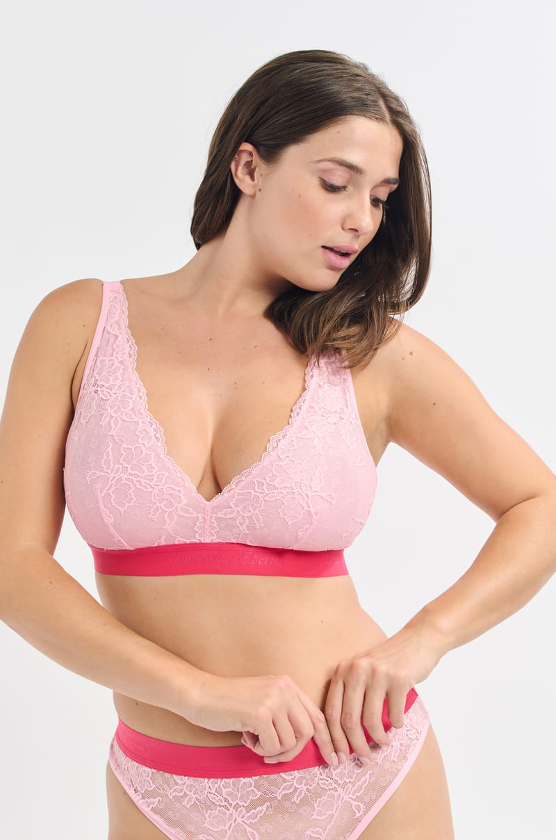 El imprescindible de Lemonade Dolls, que combina comodidad y audacia. Este triángulo está confeccionado con un encaje elástico suave y ligero, así como un panel de malla transpirable para una sensación de segunda piel. Sin aros ni copas, ofrece un soporte natural y suave. El detalle que marca la diferencia: sus tirantes dobles ajustables que dibujan un bonito escote en V, realzando la silueta con elegancia. El cierre trasero de dos filas garantiza un ajuste cómodo durante todo el día. Una pieza diseńada para realzar todas las siluetas en el día a día.
