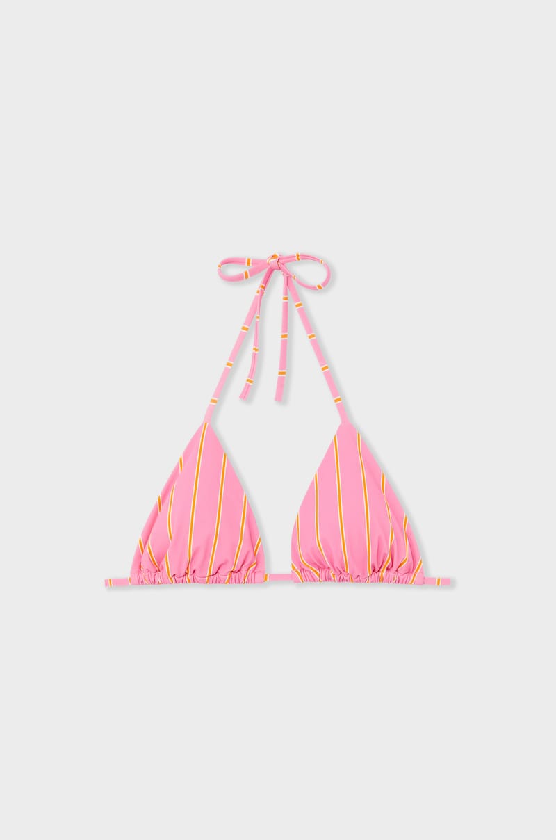 Para un look moderno en la playa, el triángulo se adorna con un estampado de rayas. Se ajusta perfectamente a la silueta con sus lazos con lazada.