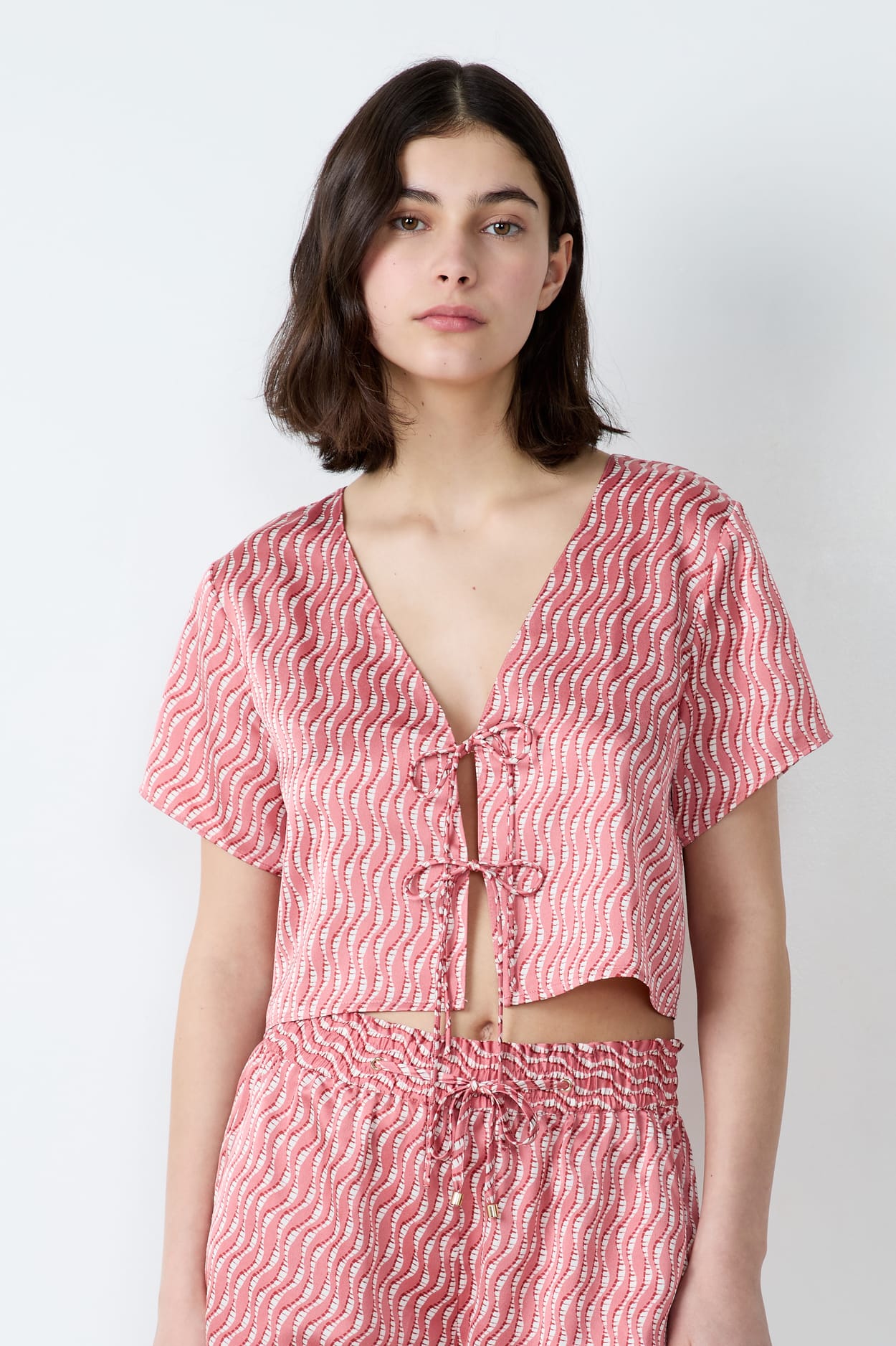 Para noches llenas de confort y suavidad, opta por este top satinado con estampado. Revela delicadamente la piel con sus lazos para atar en la parte delantera.