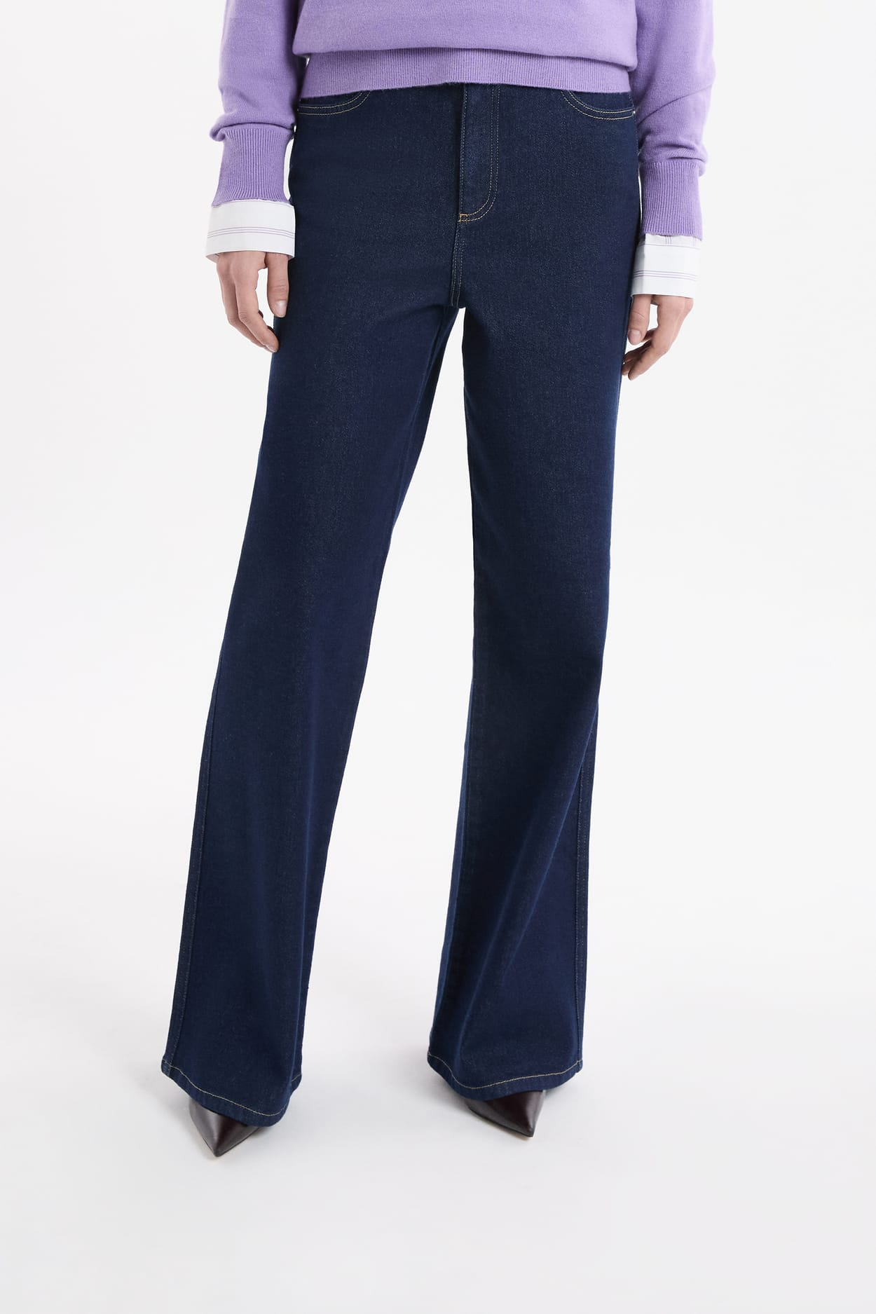 Estos vaqueros de algodón presentan un corte recto para alargar la silueta. Cuentan con un botón metálico plateado. Se pueden combinar fácilmente con una camisa, ya que son una prenda contemporánea y atemporal.