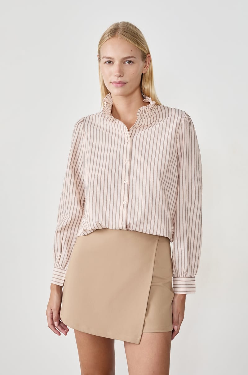 Cette chemise opte pour un col montant à volants et un motif à rayures. Elle offre un look léger et moderne....